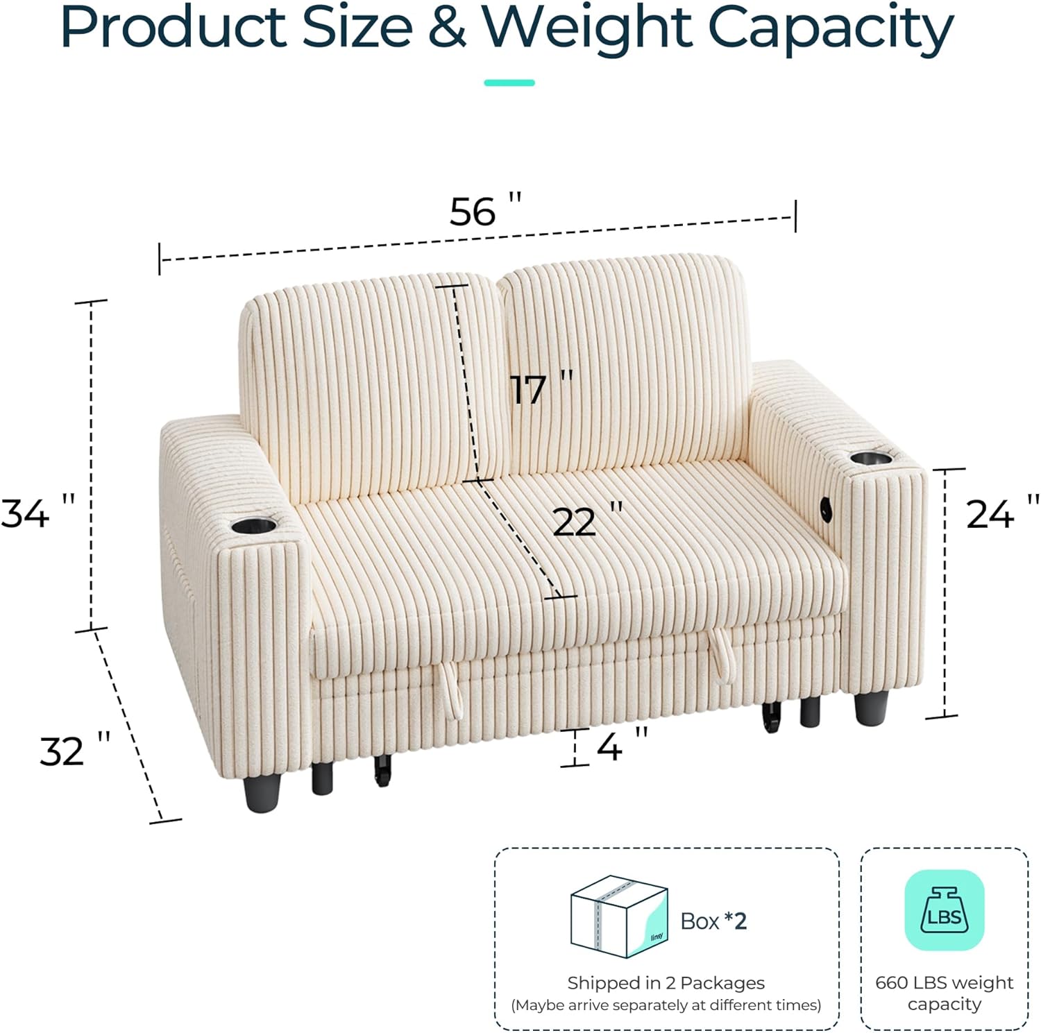 LINSY HOME Loveseat Sofa with Storage - Comfy Plush Corduroy 2 Seater Sofa with USB Charging & Cup Holders, Deep Seat Love Seat for Small Spaces Living Room Bedroom Apartment, Beige