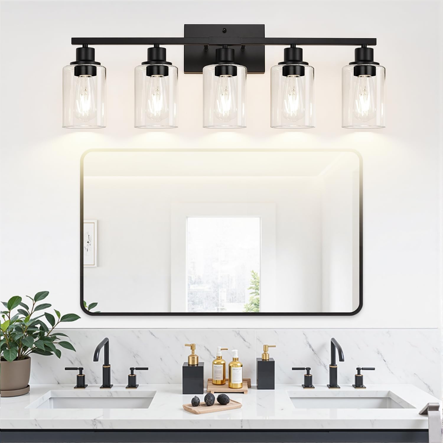 5-Light Bathroom Light Fixtures, Matte Black Modern Vanity Lights with Clear Glass Shades, Bathroom Vanity Light for Mirror Living Room Cabinet Bedroom Porch