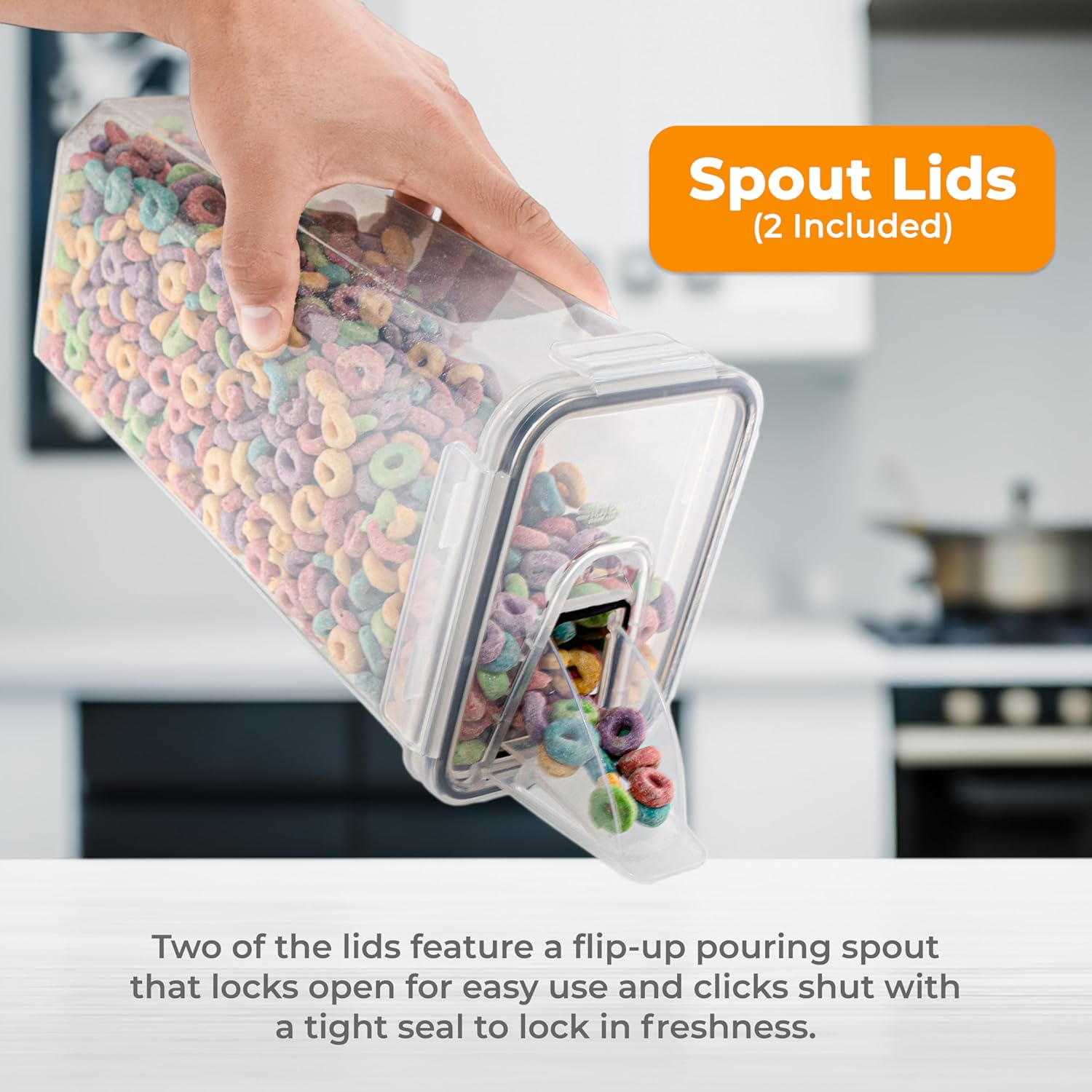 - Convenient and Practical—two tallest containers are equipped with a pouring spout for easy and mess-free pouring; in addition, they all stack nicely, and all the lids are interchangeable