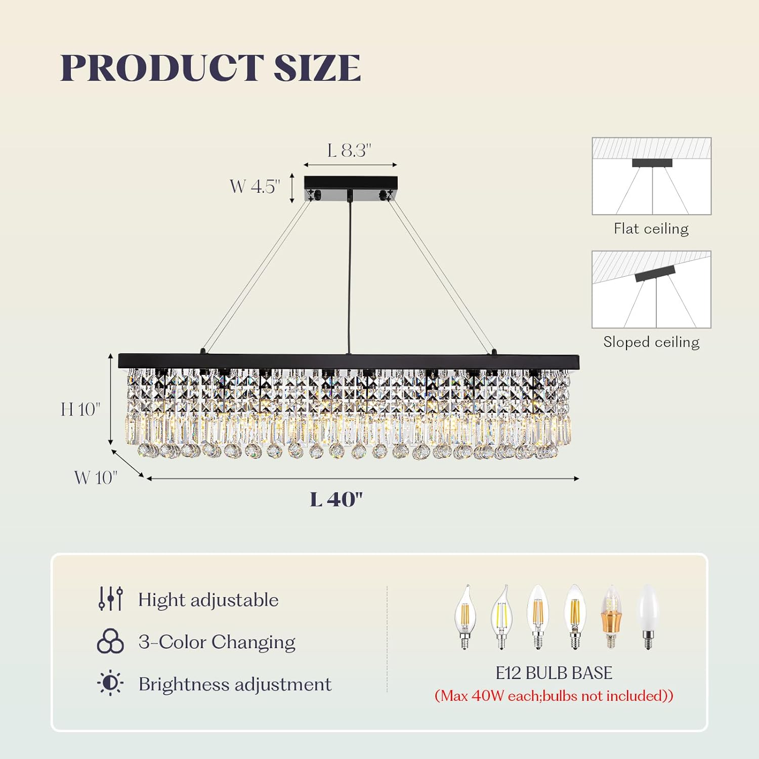 - IDEAL SIZE & ADJUSTABLE HEIGHT: This K9 chandelier measures L40" x W10" x H10", a perfect size to illuminate dining tables or kitchen islands without overwhelming the space. The hanging wires are adjustable up to 59", allowing you to set the perfect height on flat or sloped ceilings for a tailored fit in dining rooms, kitchens, living rooms, and more.