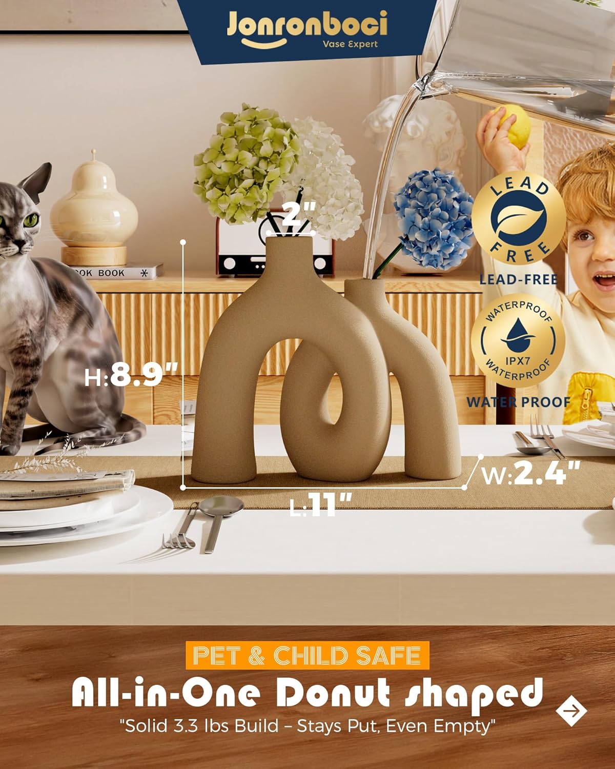 - Size - This set includes one matte tan brown handmade vases. Conjoined Size W 10" X , H Small: 7.3" and Large 8.9", with a vase neck of 1.5". Both vases feature a rustic farmhouse style.