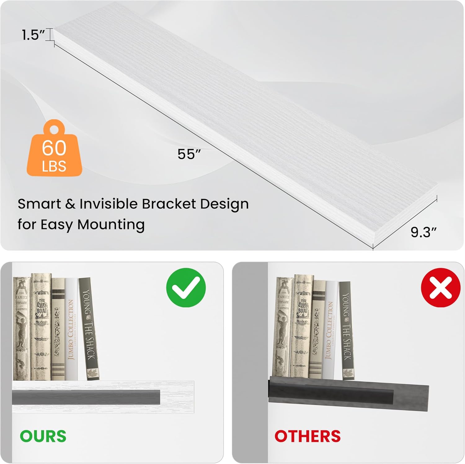 Floating Shelves for Wall, 55"W x 9.3"D x 1.5"H, Long Wooden Wall Mounted Display Shelves with Invisible Brackets for Living Room, Bedroom, Bathroom, Kitchen Decor and Storage, Set of 1, White