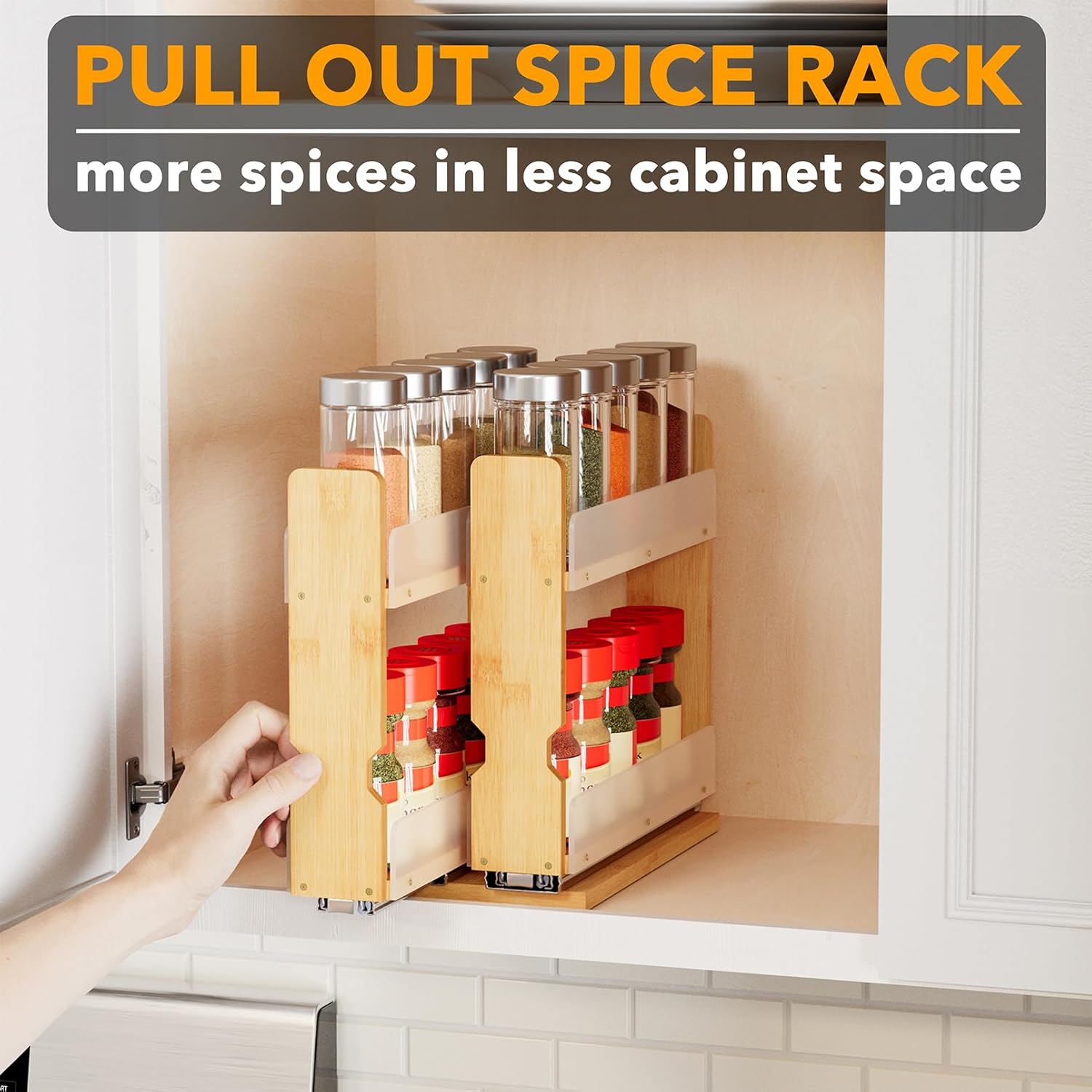 - MAXIMIZE SPICE STORAGE SPACE - The easy pull out spice rack organizer lets you store more spices in a compact area, keeping everything organized; Effortlessly access all your spices in your kitchen cabinet