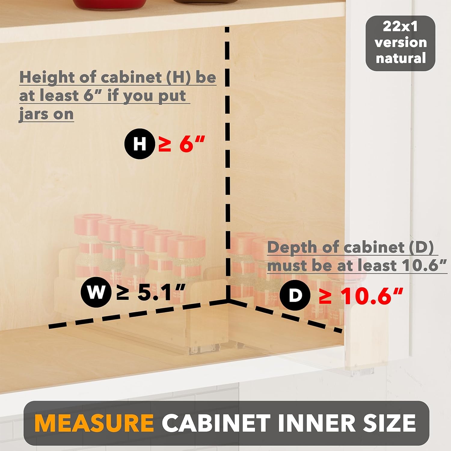 - HEAVY-DUTY SPICE RACK FOR CABINET - Smooth ball bearing glides allow easy sliding; Full extension rails give complete access to all your spices in kitchen upper cabinets; Bottom panel clears any cabinet lip for a perfect fit
