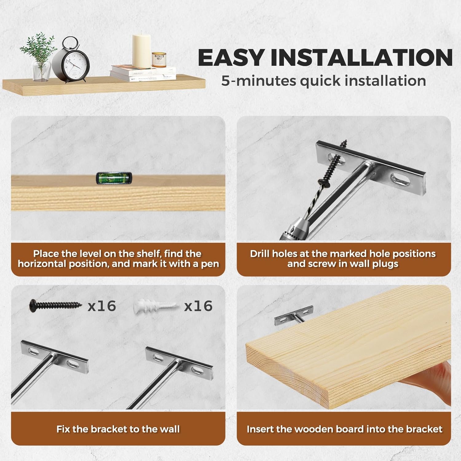- Hassle-Free Installation: Comes with all necessary hardware for easy installation shelves, including brackets and screws. Perfect for DIY enthusiasts and first-time decorators