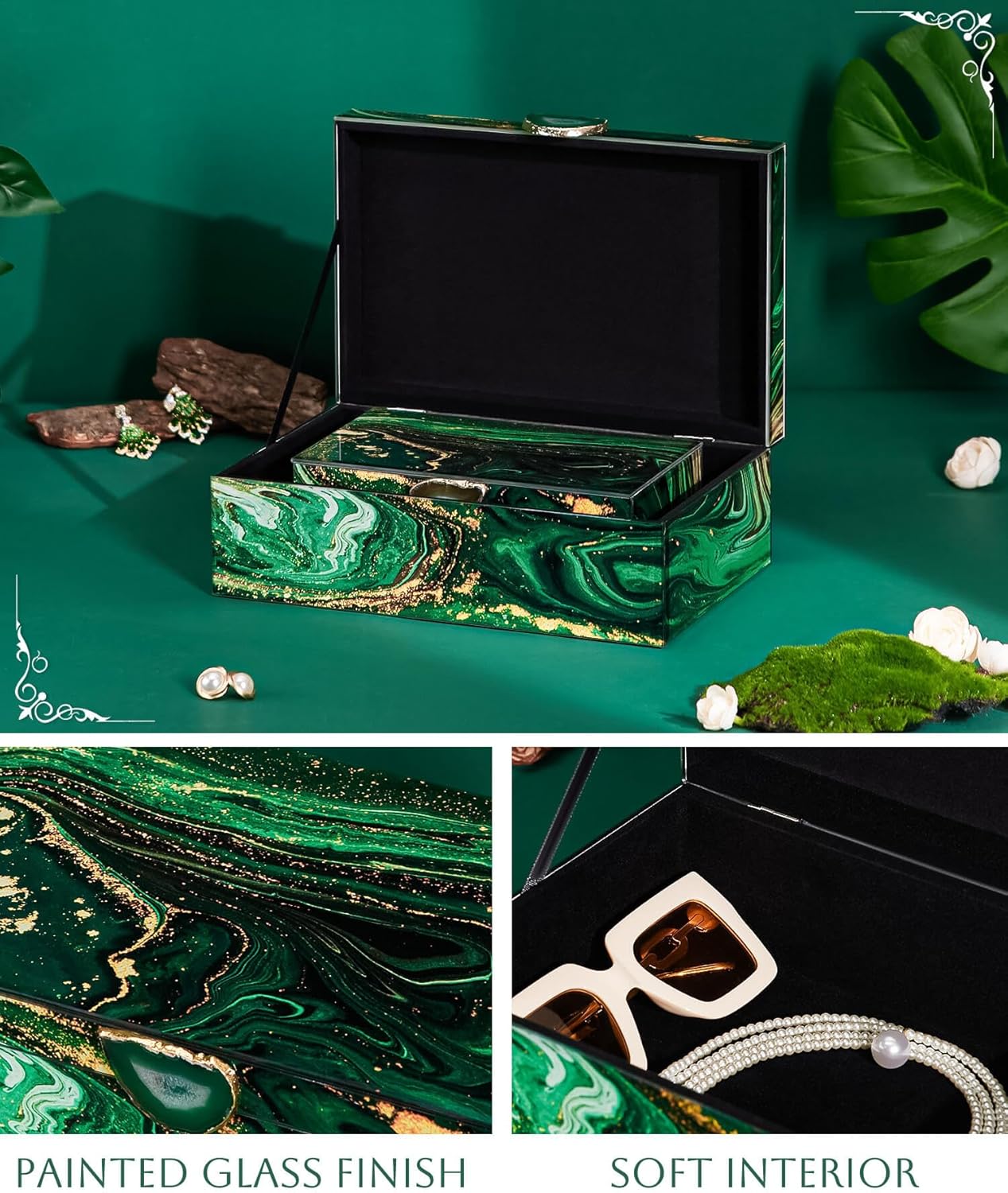 - Premium Quality Decorative Box Set: This set includes two beautifully crafted decorative boxes. The outer frames are made of luxury glass material, while the inner linings are soft velvet, ensuring durability and a luxurious feel. The large box measures 11.10Ă—7.44Ă—4.02 inches, and the small one is 8.35Ă—5.08Ă—2.83 inches. Ideal for storage, organization, or as a stylish keepsake, these boxes are a must-have for any home