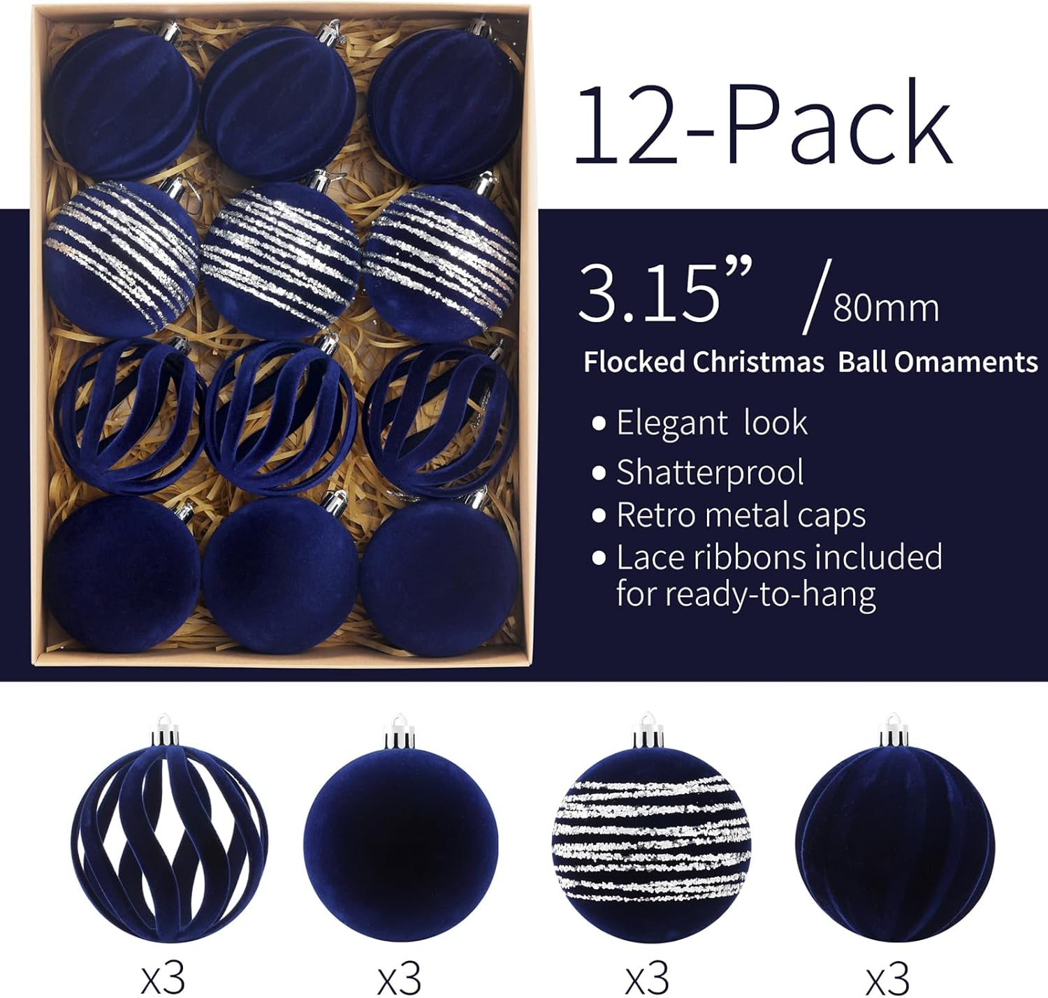 Christmas Ornaments Set of 12, 3.15" Flocked Velvet Balls with Hand Painted Designs, Navy Blue Elegant Christmas Tree Decorations in Gift Box