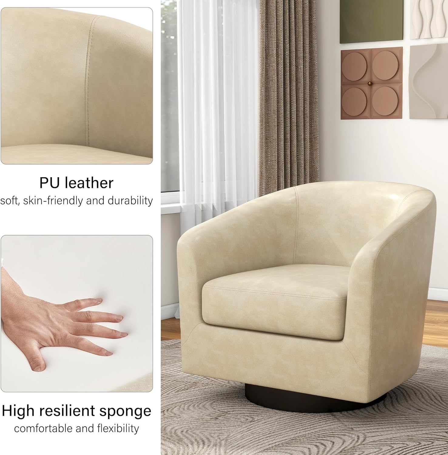 Swivel Barrel Accent Chair, Modern Round Faux Leather Arm Chair for Living Room, Bedroom, Comfy Club Reading Chairs for Adults, Faux Leather, Cream, Set of 1
