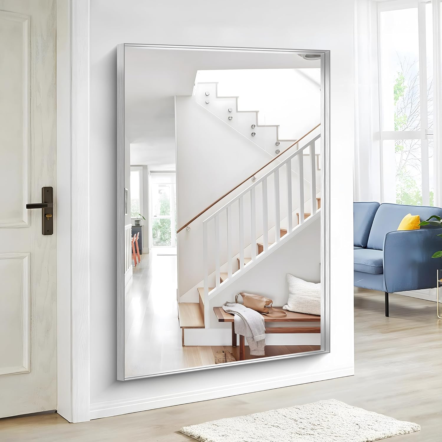- Sleek & Sturdy Aluminum Alloy Frame This elegant silver bathroom mirror features a lightweight yet durable aluminum alloy frame, designed to resist deformation, chipping, and corrosion. The slim metallic profile adds a modern touch, elevating your space with a luxurious finish. Perfect as a wall-mounted or hanging mirror, it combines strength, style, and longevity