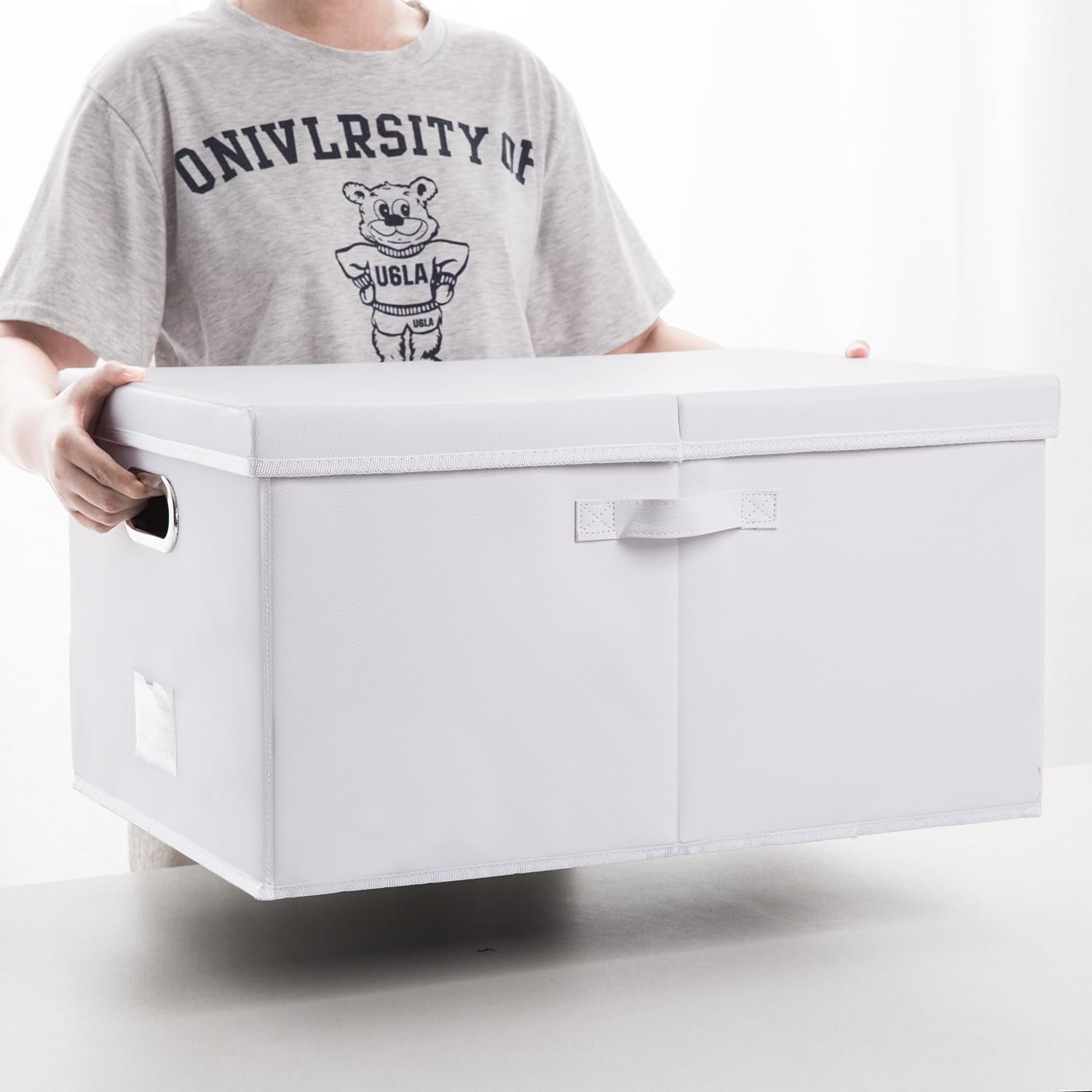 PRANDOM Collapsible Storage Box with Lid [1-Pack] Leather Fabric Foldable Storage Bin Organizer Container Basket Cube with Cover for Home Bedroom Closet Office Nursery White (22.8X15.7X11.8)
