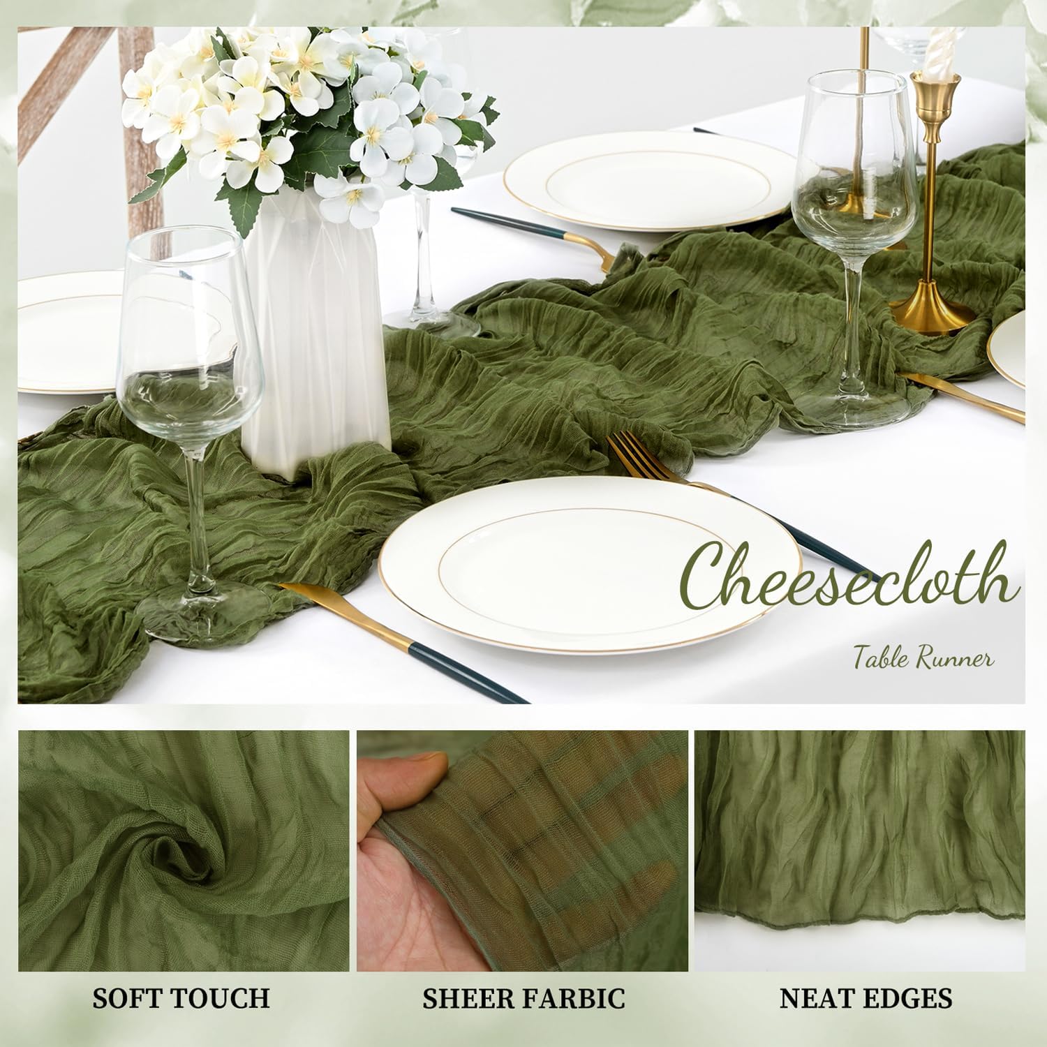 - Cheesecloth Table Runner Size: You will receive 6 olive green cheesecloth tablerunner, each measuring 20 x 120 inches. The quantity is sufficient for you to decorate various romantic occasions. It can decorate most shaped tables, such as rectangular tables, round tables, and cocktail tables. It is long enough to decorate a large table and be placed perfectly and elegantly on the tabletop, adding a romantic atmosphere to your occasion.