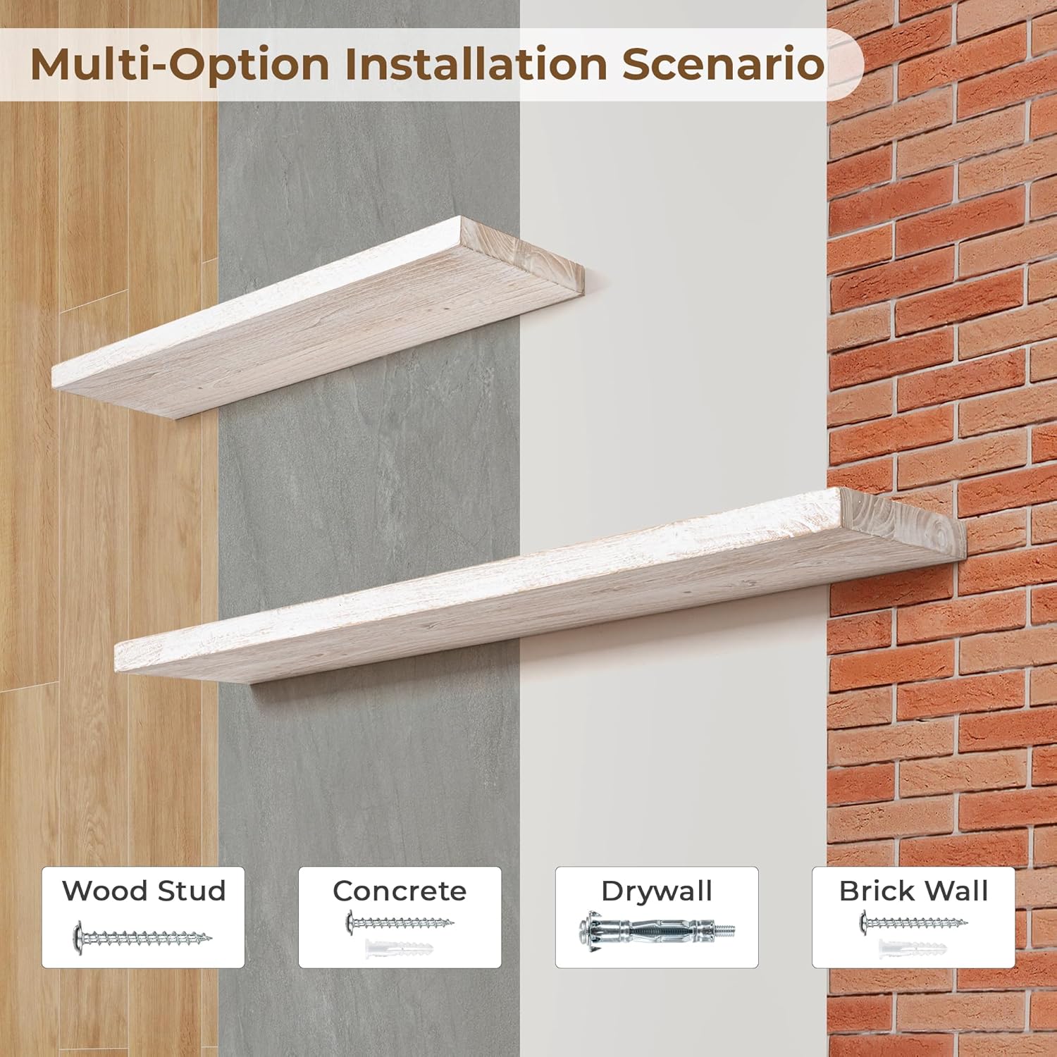 Axeman Floating Shelves for Wall - 32''W x 8'' D Rustic Solid Elm Wood Shelves for Storage, Wall Mounted Display Shelving with Invisible Heavy-Duty Metal Bracket (White Wash, 2PCs)