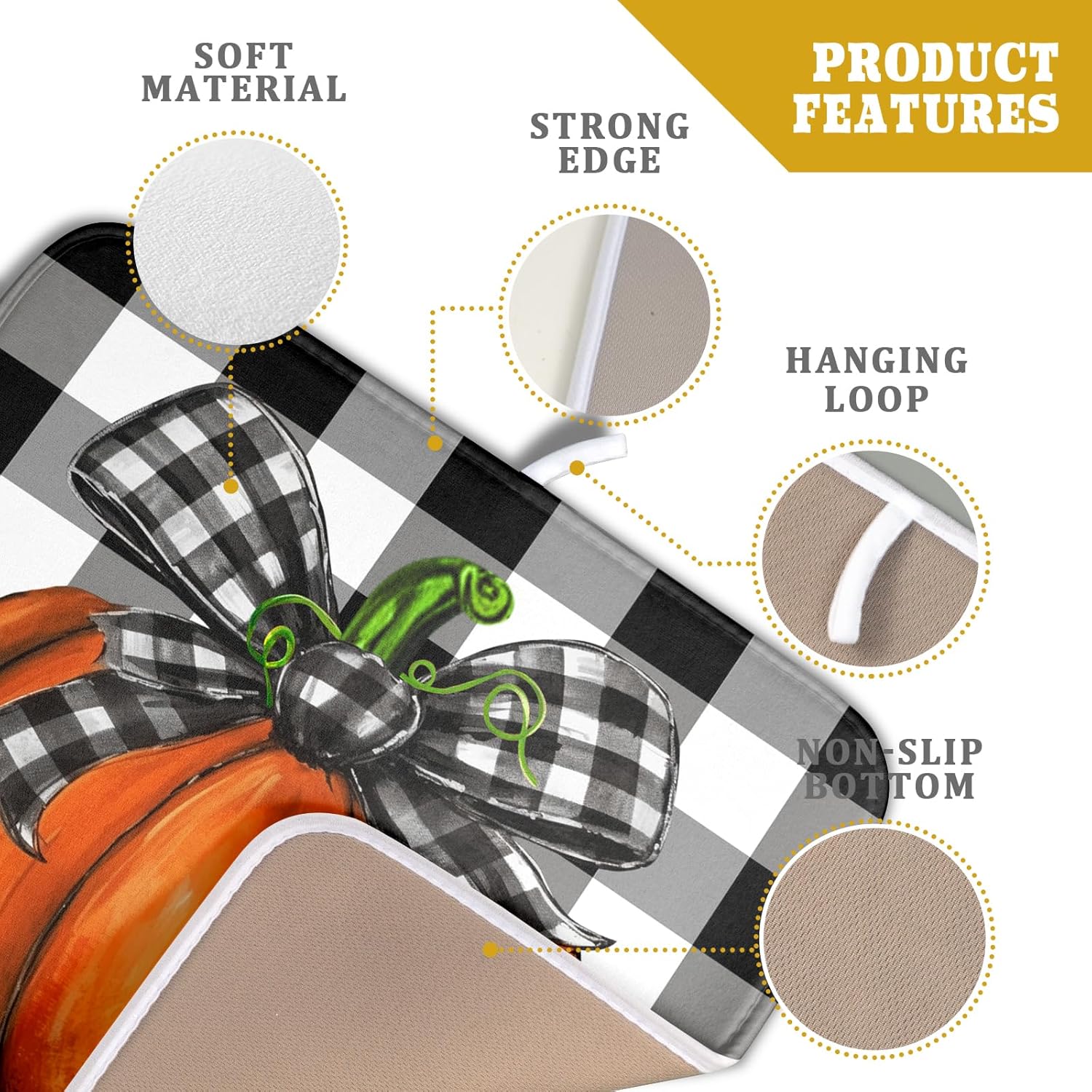 Fall Pumpkin Dish Drying Mat for Kitchen Counter Black White Buffalo Check Thanksgiving Super Absorbent Reversible Microfiber Kitchen Countertop Protector Dishes Pad Small 16x18 inch