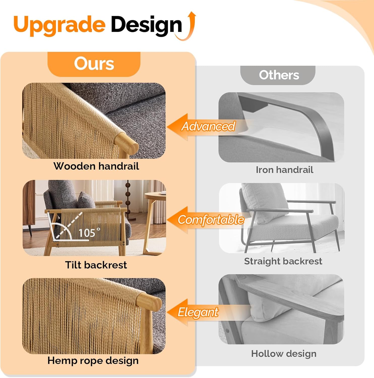 - Braid Design : The Boho-inspired Braid Accent Chair showcases elegant paper cord weaving across its angled armrests. Its thoughtful design combines comfort and style with a medium-height backrest and plush cushioning. This piece seamlessly blends casual and sophisticated interior comfort, perfect for home decoration.