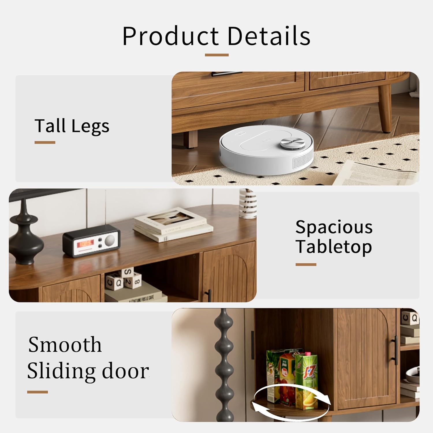 - Elegant TV stand: This mid-century modern style TV stand features curved sliding doors and arched doors, decorated with grooved vertical stripes and metal black handles. The unique design style adds a touch of elegance to the living room or bedroom. It is easy to operate, and the curved design is safer, reducing the risk of accidental collisions, making it an ideal furniture choice for improving the happiness index of the home