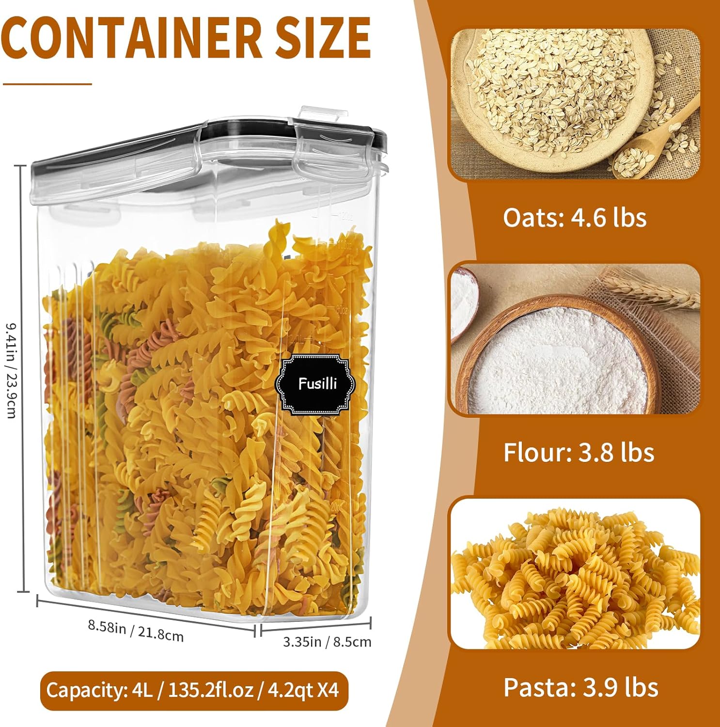 Cereal Containers Storage Set (4L / 135.2oz), 4PCS Airtight Food Storage Containers with Lids, Cereal Dispensers for Kitchen Pantry Organization and Storage with Pour Spout, 20 Labels, Marker