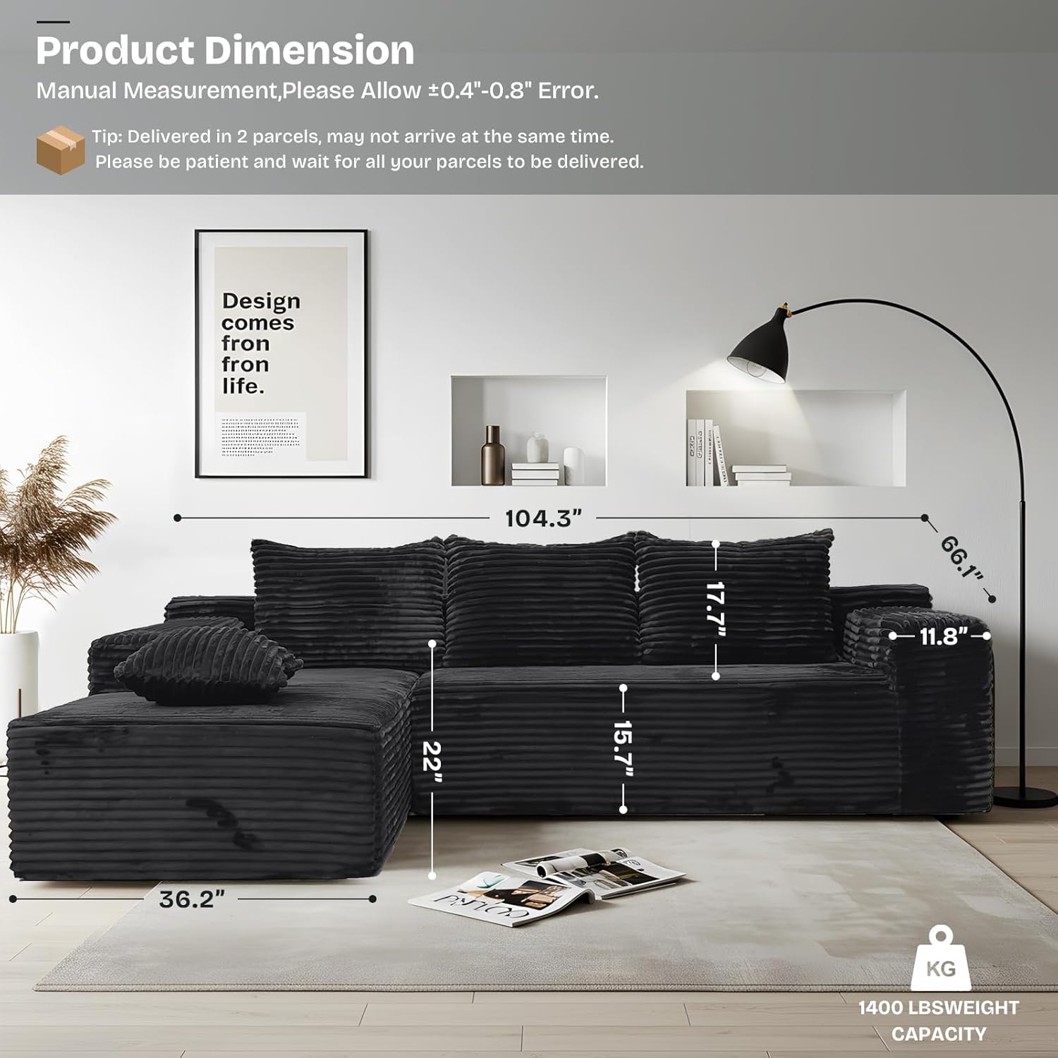 104" Modern Modular L-Shape Sofa Couch with Chaise Black Faux Rabbit Fur Cloud Sectional Couch with Deep Seat Modular Sectional Sofa No Assembly Required Upholstered Couches for Living Room Bedroom
