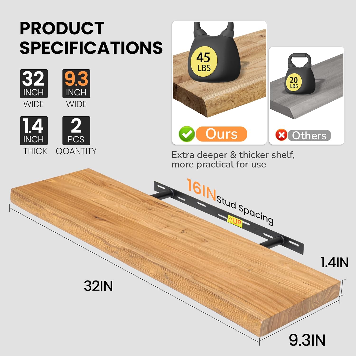 Fun Memories Floating Shelves for Wall, Live Edge 32" W x 9.3" D x 1.5" H Wood Floating Shelf, Set of 2 with Invisible Heavy-Duty Metal Bracket, Deep Floating Shelf for Living Room Kitchen, Natural