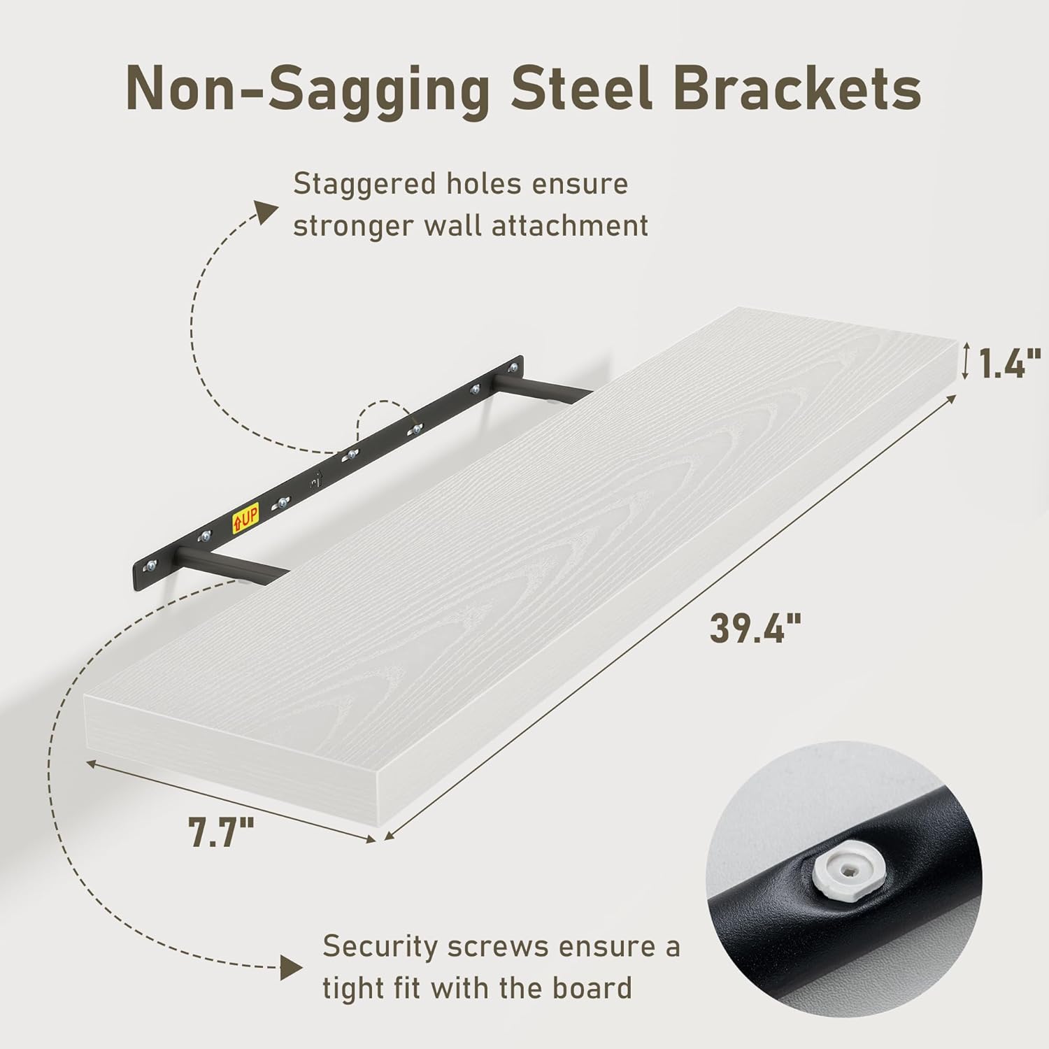 White Floating Shelves Wall Shelf 40 Inch, 8 Inch Deep Floating Shelf for Wall, Farmhouse Black Wood Shelves Invisible Bracket for Living Room, Bedroom, Kitchen, 40 x 8 x 1.4 Inch, Set of 2