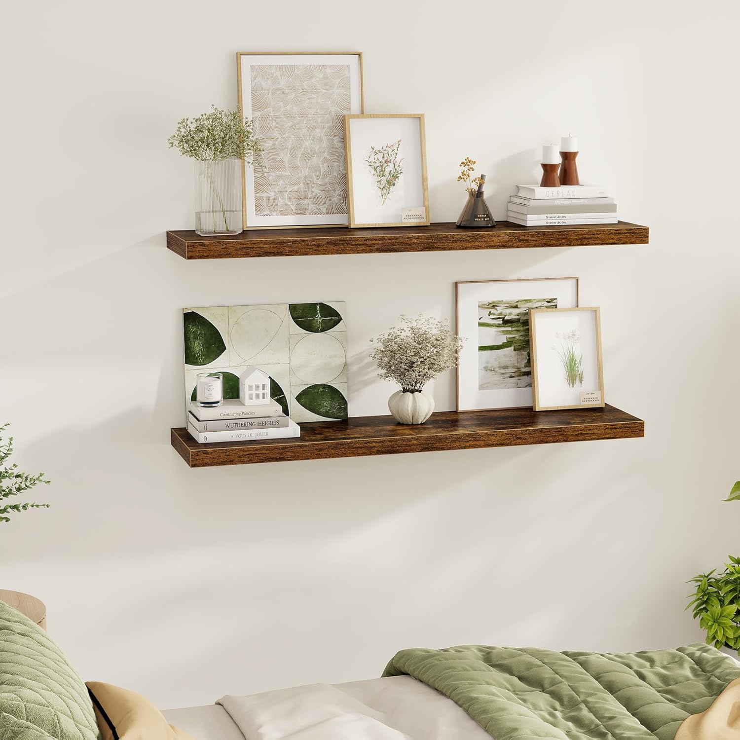 Floating Shelves Wall Shelf 48 Inch, 9.3 Inch Deep Floating Shelf, Farmhouse Black Wood Shelves Invisible Bracket for Living Room, Bedroom, Kitchen, 48 x 9.3 x 1.4 Inch, Set of 2, Rustic Brown