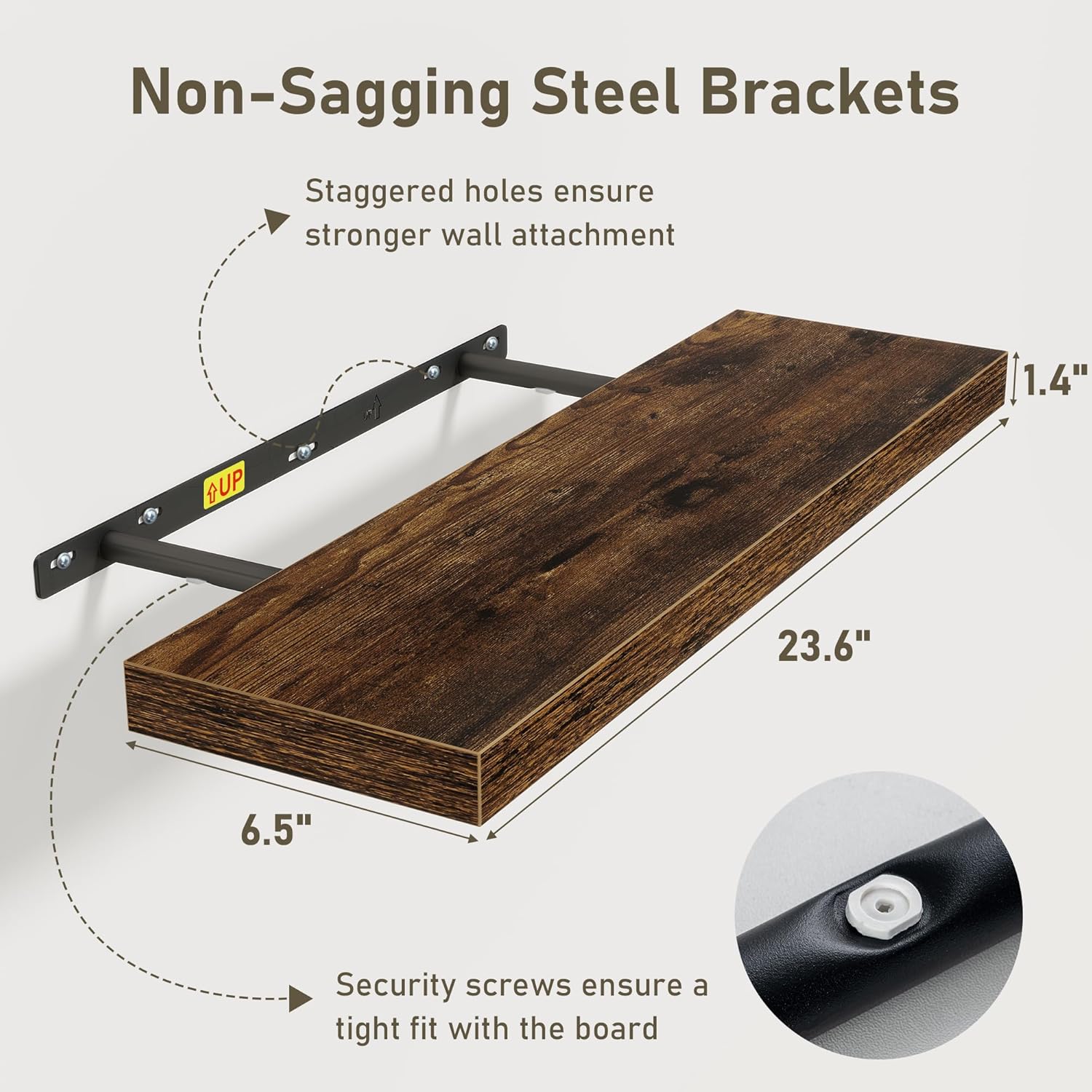 - Easy To Assemble: This floating shelves not only come with stainless-steel galvanized invisible brackets, but also equipped a fixing screw at the bottom to fix the shelf on the support rod, which solves the problem of sliding and is not easy to damage, and can be used for a long time. Instructions, magnetic level, drywall anchors, and screws included. This is great because you can easily mount these rustic shelves Gap-Free to any surface in less than 10 minutes