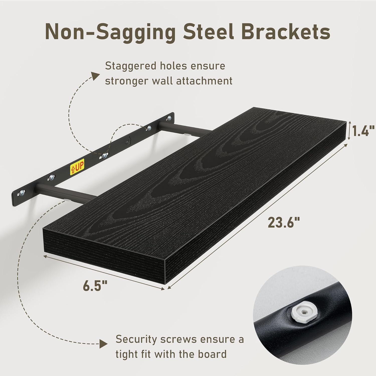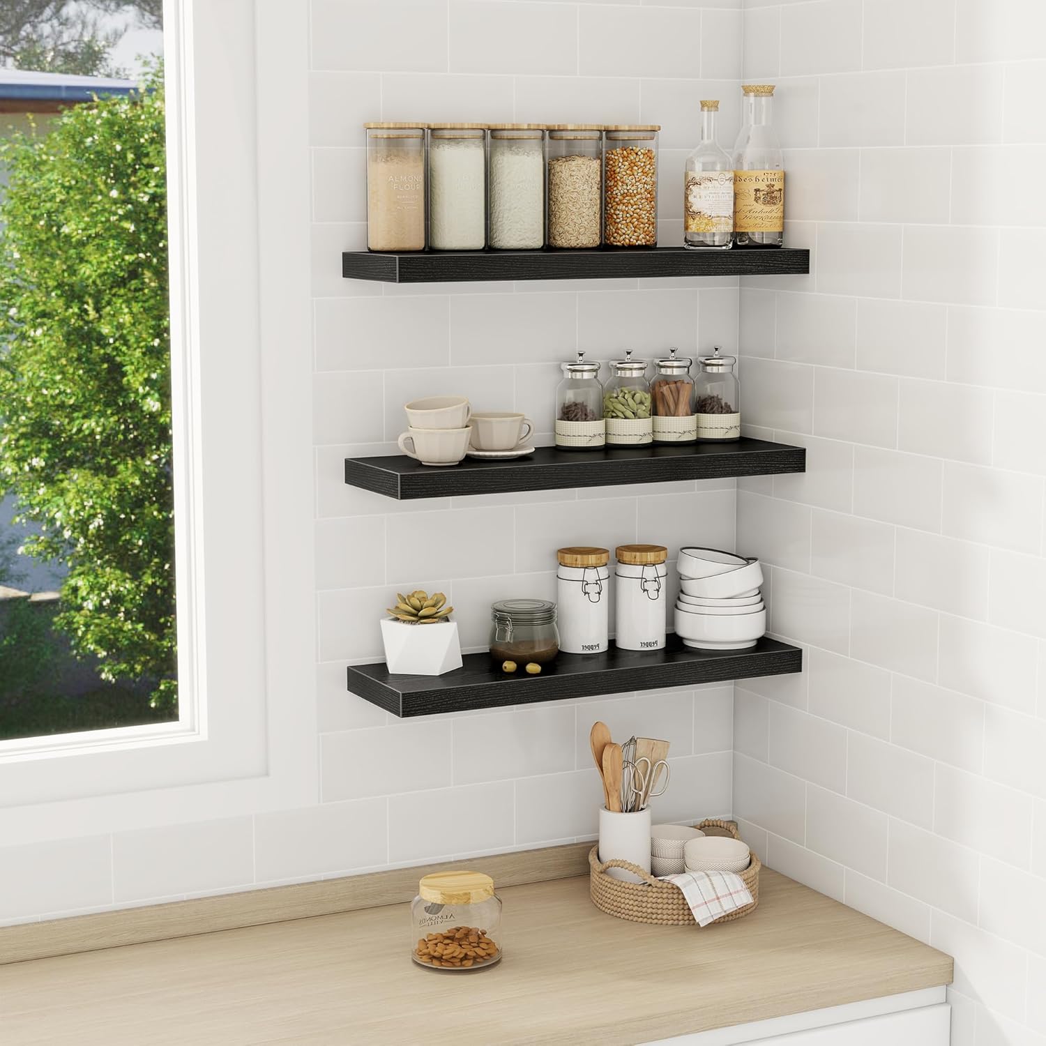 Fun Memories Black Floating Shelves Wall Shelf 24 Inch Long, Rustic Bathroom Shelves, Wall Mounted Wood Floating Shelf for Kitchen, Living Room, Bedroom, 24 x 6.7 x 1.4 inch Set of 3