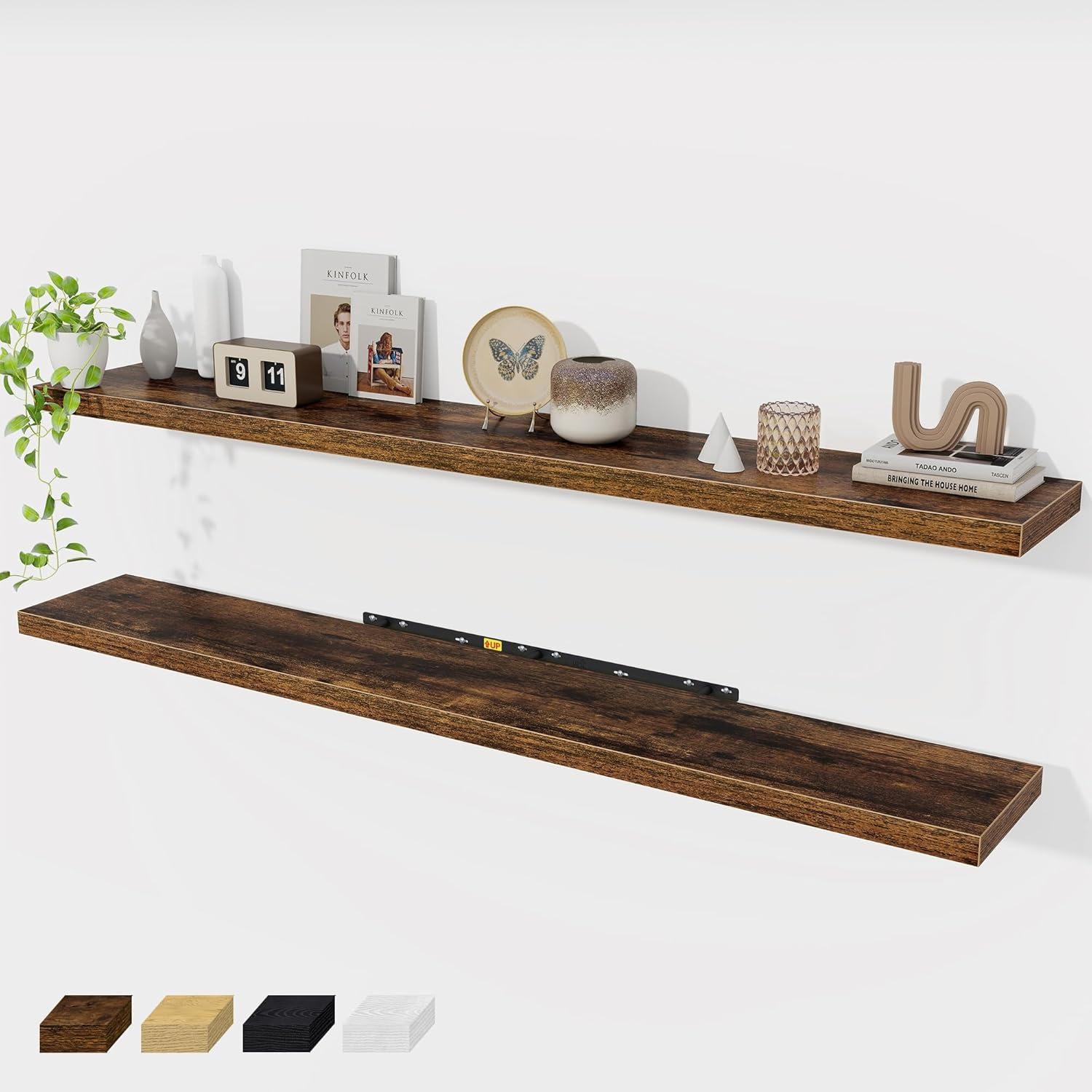 - 72 Inch Floating Shelves for Wall (Set of 2): Each wall shelves are 9.3 inches in depth and 1.4 inches in thickness. 2-piece set is more cost-effective and practical. Our wall shelf can be used in combination, staggered high or low on the wall, or mounted side-by-side to provide extra storage space for organizing small items and clutter in multiple areas such as kitchens, bathrooms, and bedrooms, creating a clean and smooth look. Multiple colors available