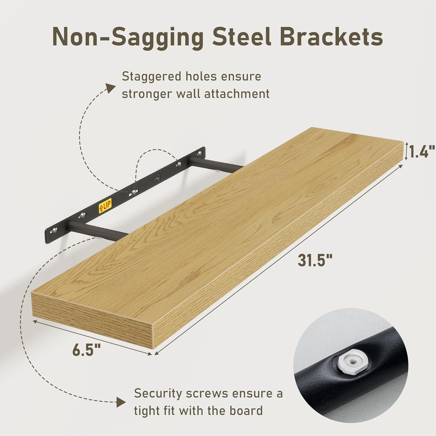 Fun Memories 32 Inch Floating Shelves Wall Shelf Set of 3, Rustic Farmhouse Home Decor Kitchen Living Room Shelves Wall Mounted, 32 x 6.7 x 1.4 Inch, Oak Color