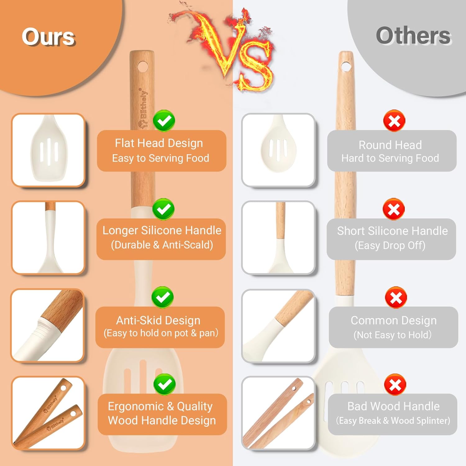 - 🥄【Comfortable & Ergonomic Wooden Handle】This Silicone Cooking Spoons are designed with natural wood handle. The smooth round handle can reduce hand fatigue during prolonged cooking sessions.The natural wood provides a secure grip, resists heat transfer, and complements modern kitchen aesthetics, and fits comfortably in your palm, offering precision for delicate tasks like flipping eggs or portioning pasta.