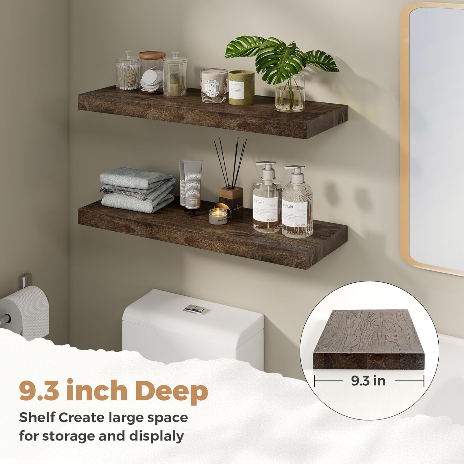 - 9.3" DEEP-MORE SPACE&MORE TIDINESS: Measuring 9.3 inches deep and 1.4 inches thick, the floating wood shelves perfect for various scenes and have a strong storage capacity, from books and photos to small plants. Perfect for any room in your home, including living rooms, offices, kitchens, and more