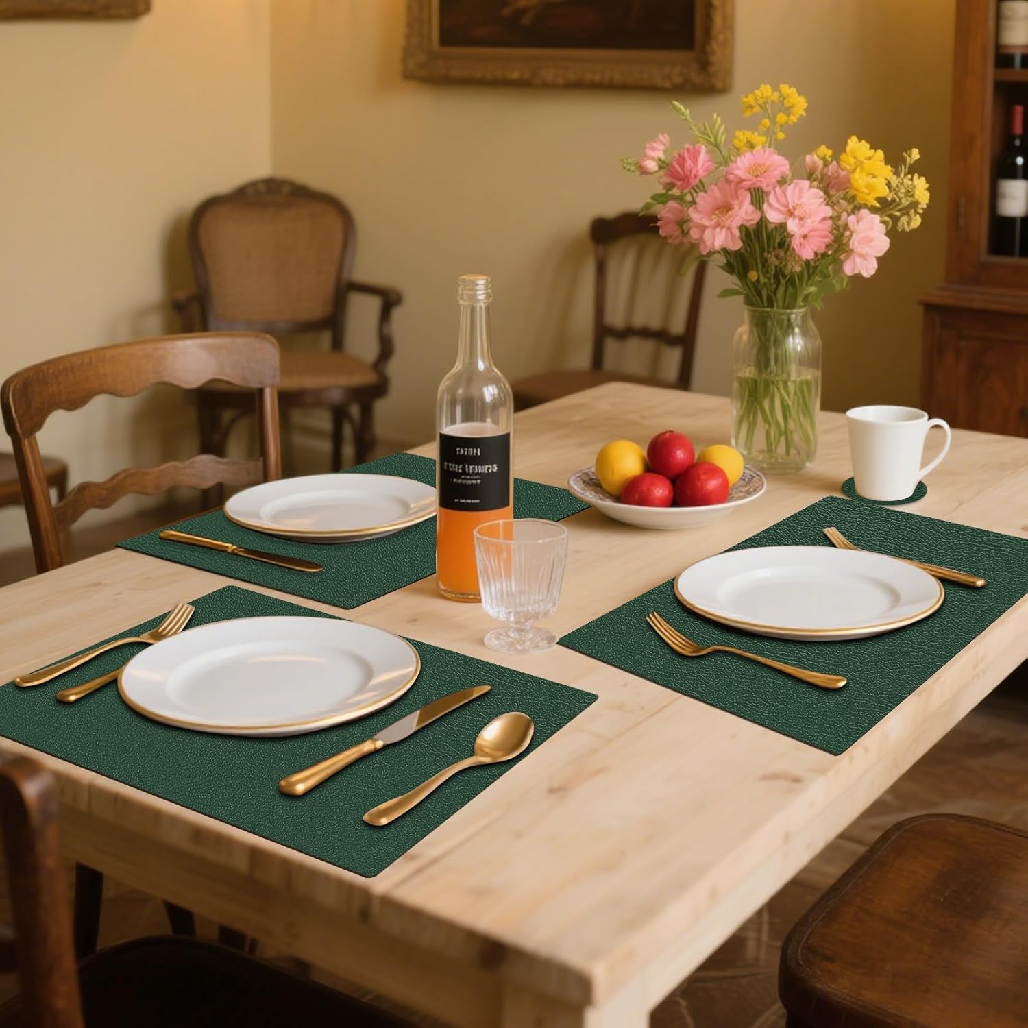 Placemats and Coasters Set of 6, Waterproof、Oil-Proof Wipeable、Anti Slip PVC Leather Place Mats, Heat Resistant Reversible Table Mats for Kitchen, Dining, Outdoor 17’’×12’’, (Dark Green)
