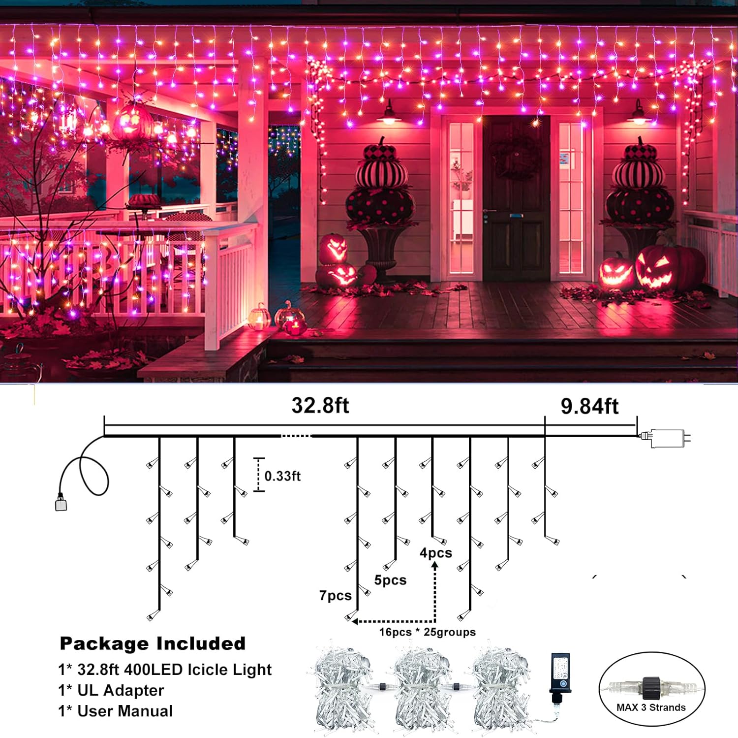 Orange and Purple Halloween Lights Outdoor, 33FT 400 LED Icicle Lights for Outside with Waterproof 8 Modes, Plug in Timer String Twinkle Light for Indoor House Yard Party Holiday Decorations