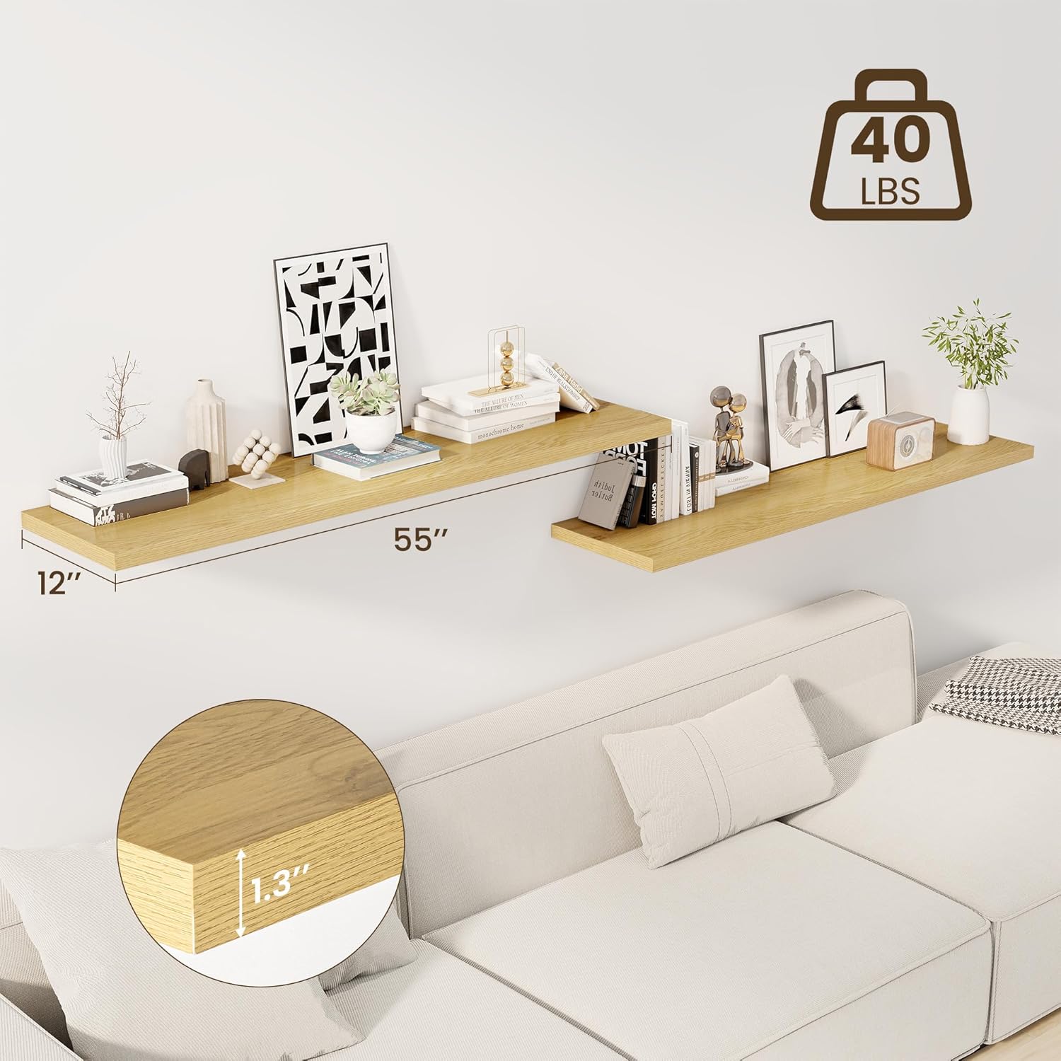55" Floating Shelves for Wall, 12" Deep Slim Oak Floating Shelves, Wall-Mounted Shelves for Bedroom, Living Room, Kitchen, Bathroom - Set of 2