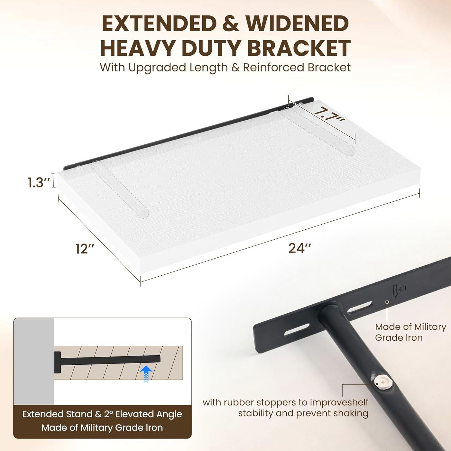 24" Floating Shelves for Wall, 12" Deep Slim White Floating Shelves, Wall-Mounted Shelves for Bedroom, Living Room, Kitchen, Bathroom - Set of 2