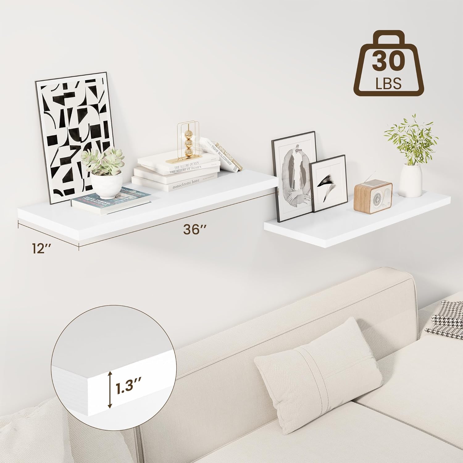 36" Floating Shelves for Wall, 12" Deep Slim White Floating Shelves, Wall-Mounted Shelves for Bedroom, Living Room, Kitchen, Bathroom - Set of 2