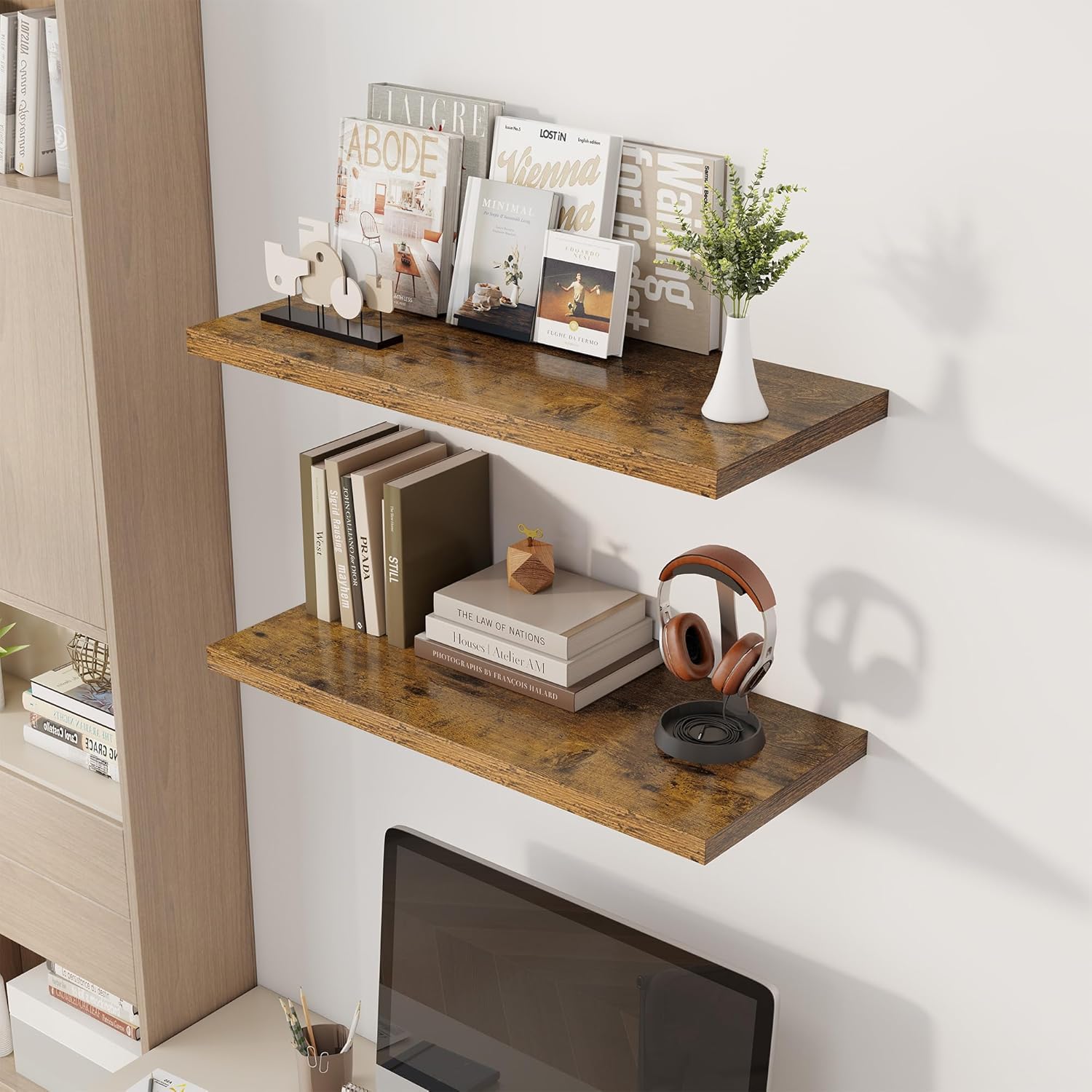 - Space Optimization: Our wood shelves come in rich colors and sizes. Featuring a simple flat design, they effortlessly adapt to various home styles—from modern to rustic farmhouse.