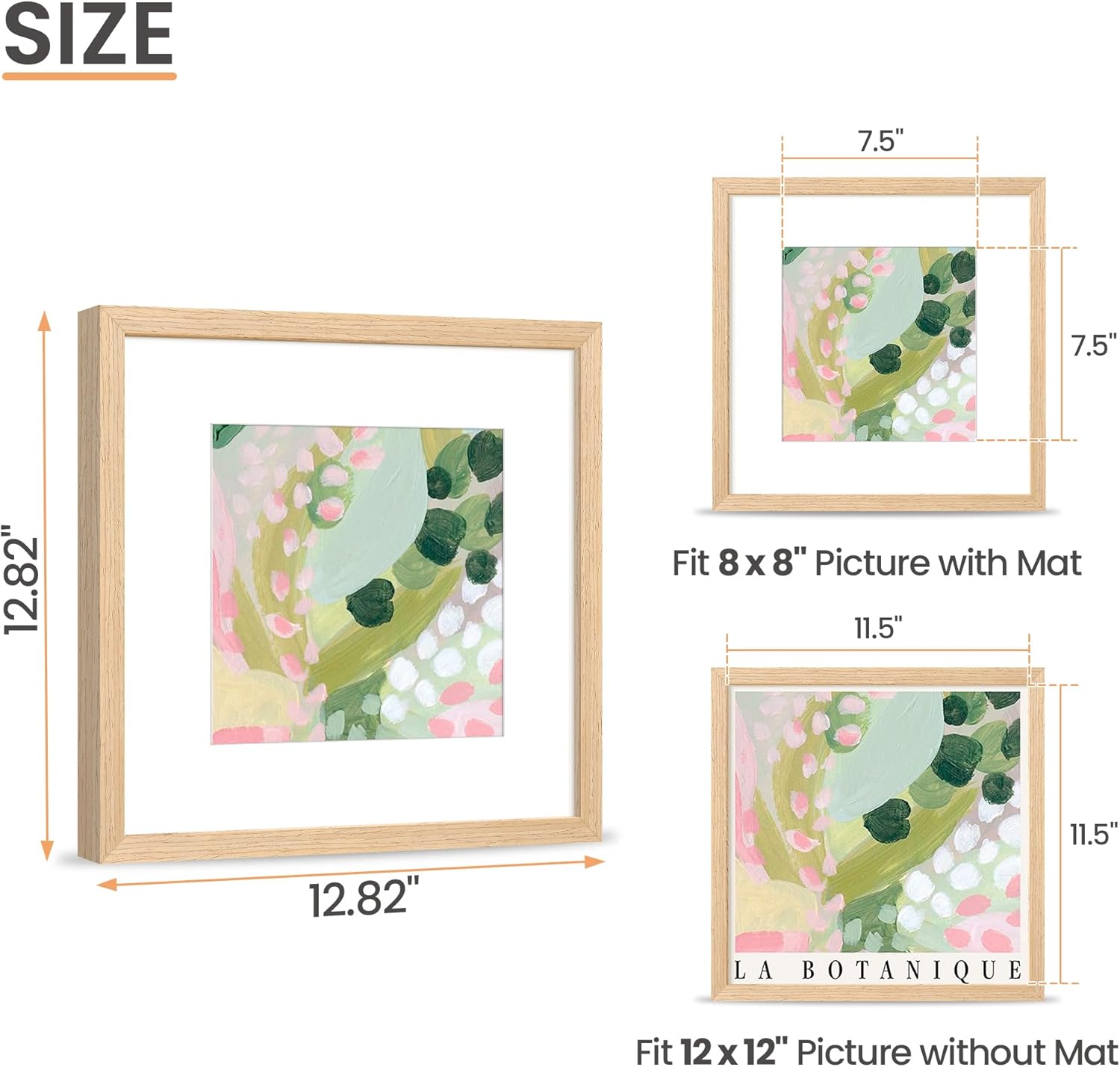 - Sizes Attention: The display size will be 0.5inch smaller than the photo size to better stable the photo and prevent it from falling off. The actual display size is 7.5x7.5 inch with mat and 11.5x11.5 inch without mat.