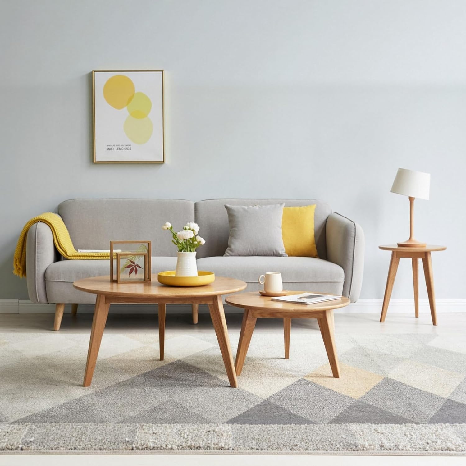 100% Solid Oak Wood Coffee Table Set, Round Coffee Table Combo Side Table w/Solid Wood Legs, Mid Century Table Sturdy Tables for Bedroom Balcony Living Room (Natural, 3 Pieces)