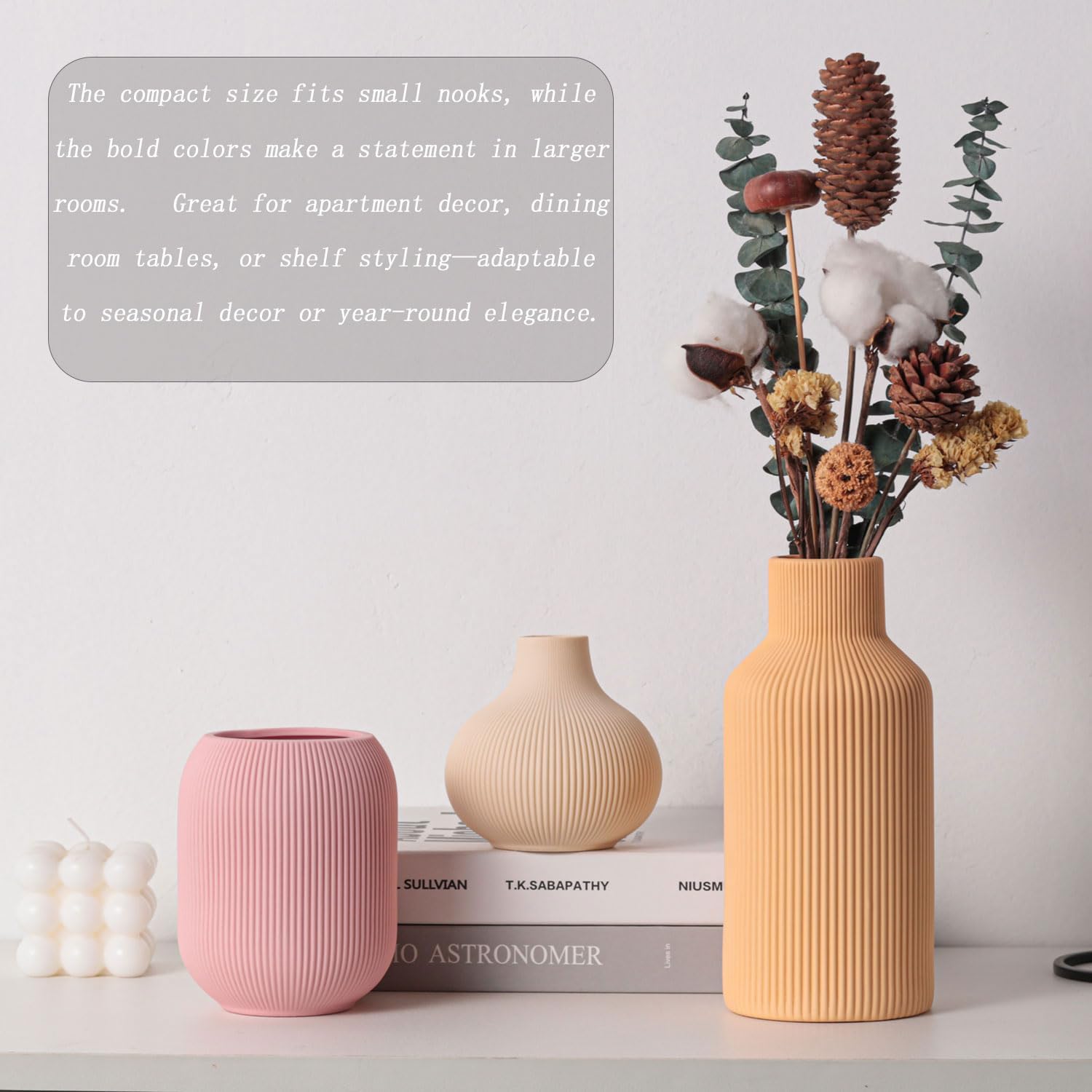 - Modern Minimalist Japandi Design:Elevate your space with this decorative 3-piece ceramic vase set featuring ribbed texture and a soft color palette (pink + light yellow + orange). Blending modern minimalist aesthetics with Japandi style, the clean lines and subtle geometric ridges create an elegant, timeless look. Perfect for contemporary, Nordic, or rustic decor, these vases add understated sophistication to any room—from living rooms to home offices.