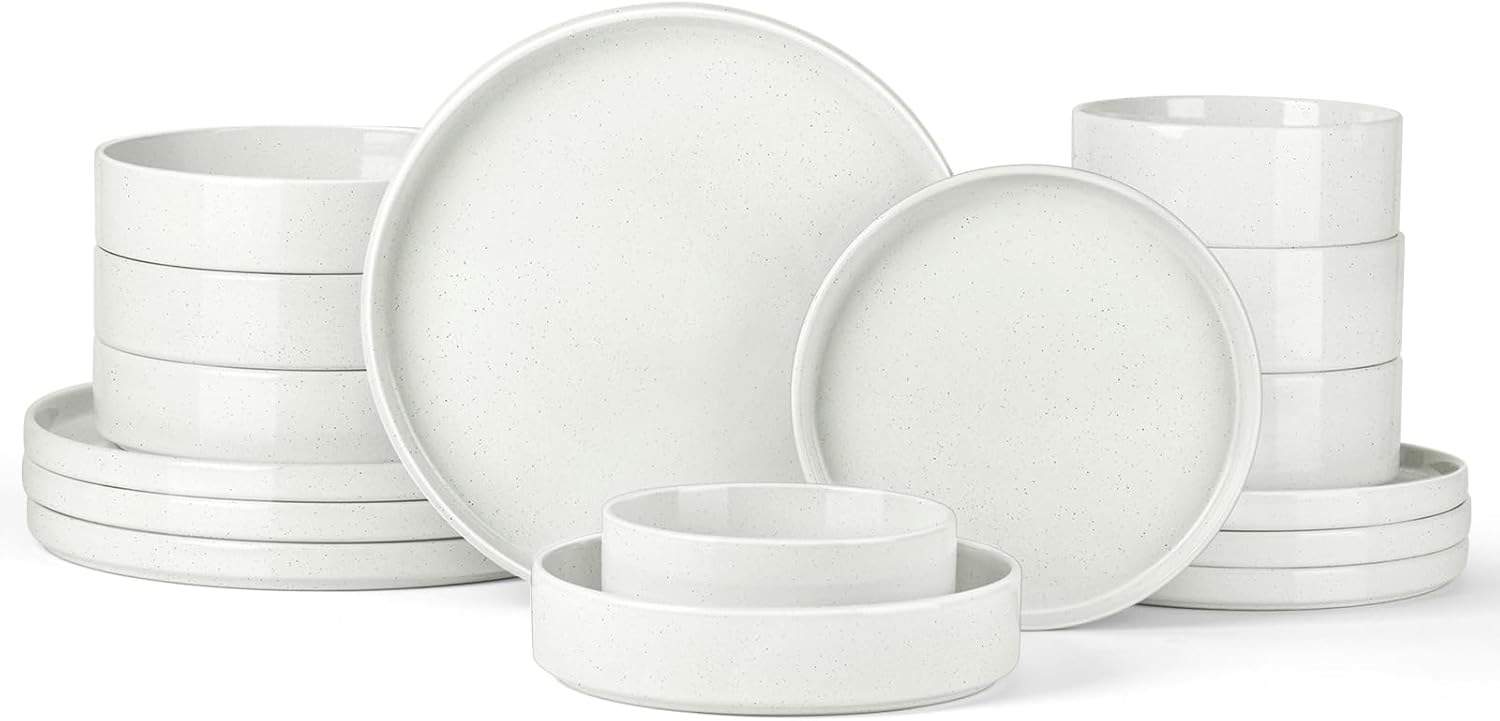 Stoneware Dinnerware Sets for 4 with Pasta Bowl, Onader 16 Piece Plates and Bowls Dish Set, Speckled Kitchen Dishware Dining Ware, Microwave & Dishwasher Safe - Cloud White