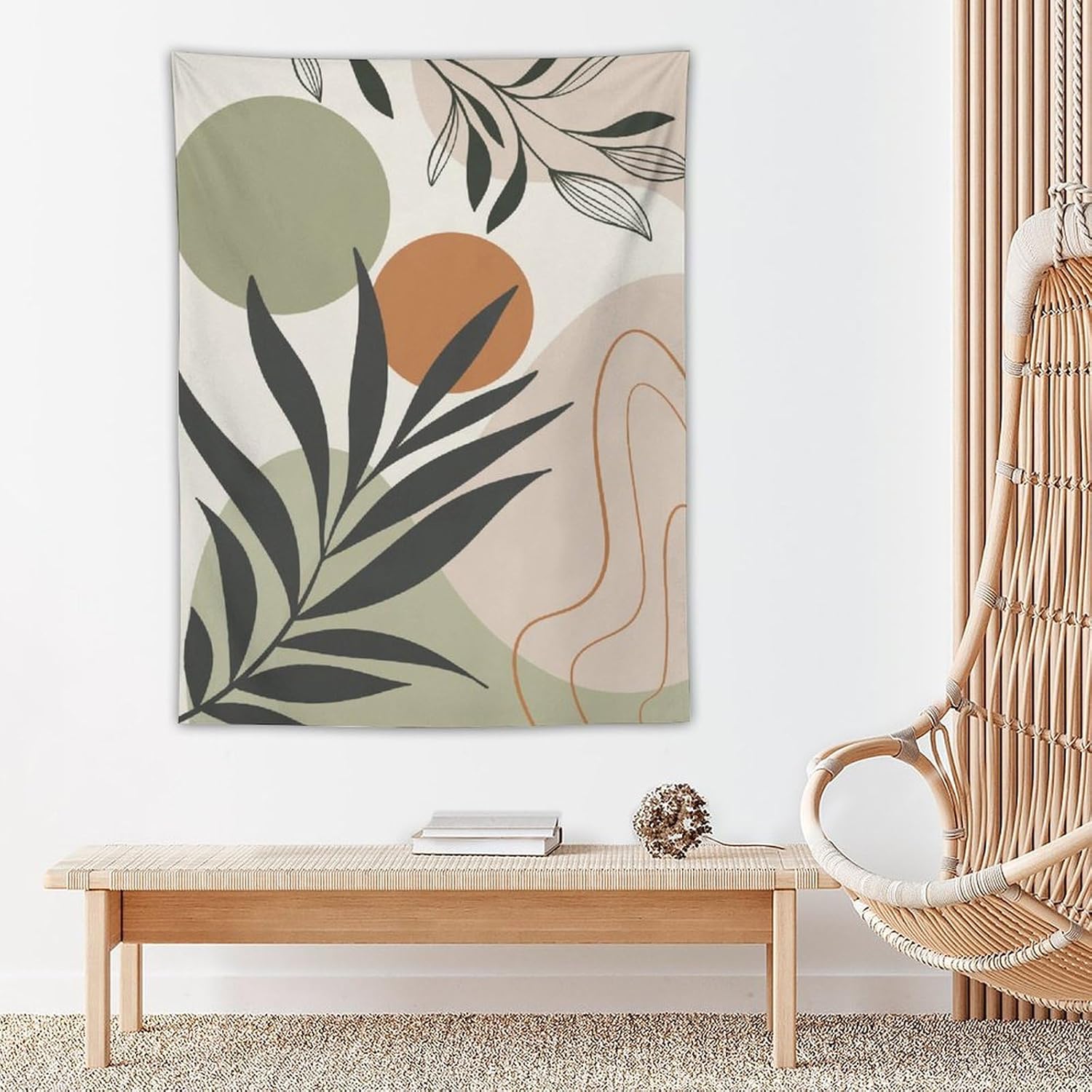 Abstract Bohemian Mid Century Tapestry, Tropical Leaves Modern Geometric Archway Minimalist Bohemian Botanical Aesthetic Wall Hanging, Sage Green Gold Home Decor Art for Bedroom 60x60 Inch