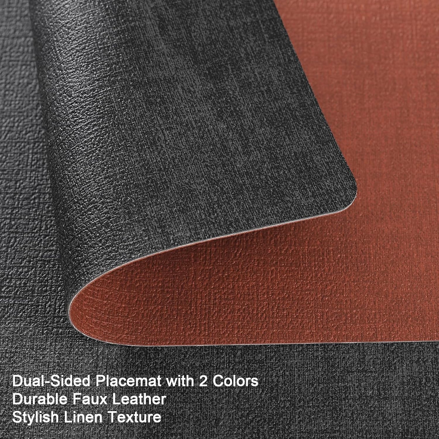 - These placemats are made of faux leather, the sufface texture imitate the linen. Unlike woven or fabric placemats, these placemats are water resistant, they can block the sauce or any liquids to protect the desktop.
