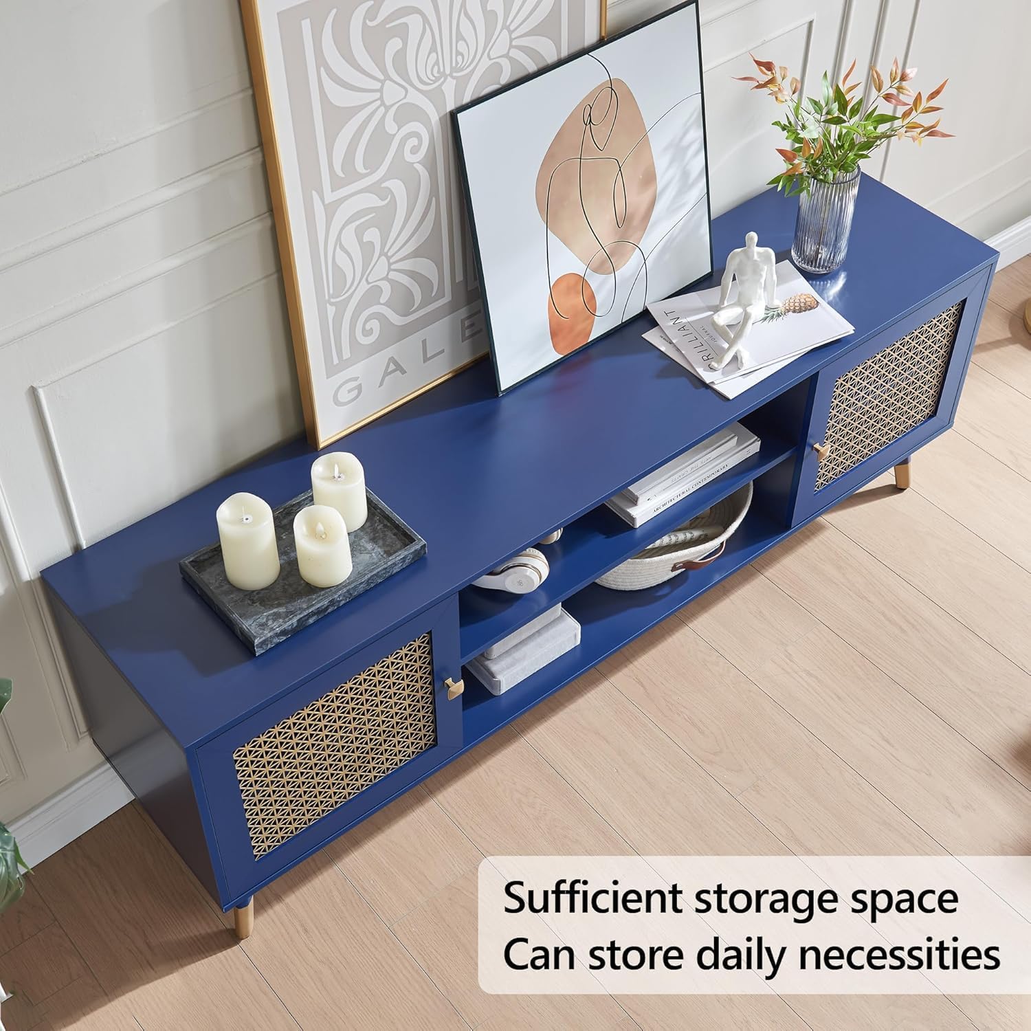 Mid Century Modern Entertainment Center, Blue TV Stand for TVs up to 75", Boho Tv Furnitures with Storage Cabinet and Shelves, Tv Console Media Center with Gold Metal Mesh Doors for Living Room