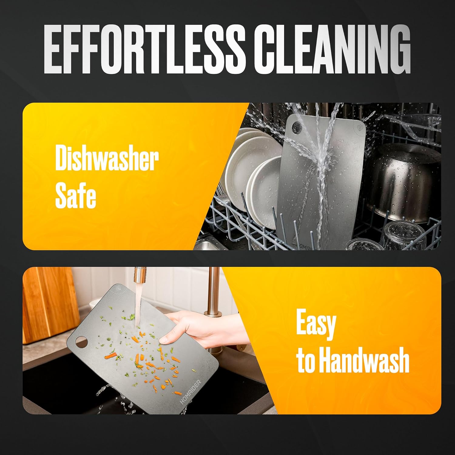 - 🧼 Effortless Cleaning – Dishwasher Safe & Odor Resistant No more lingering odors or hard-to-clean surfaces. The non-porous titanium surface rinses clean in seconds and is 100% dishwasher safe. It doesn’t retain moisture or bacteria—ensuring easy maintenance and top-tier hygiene.