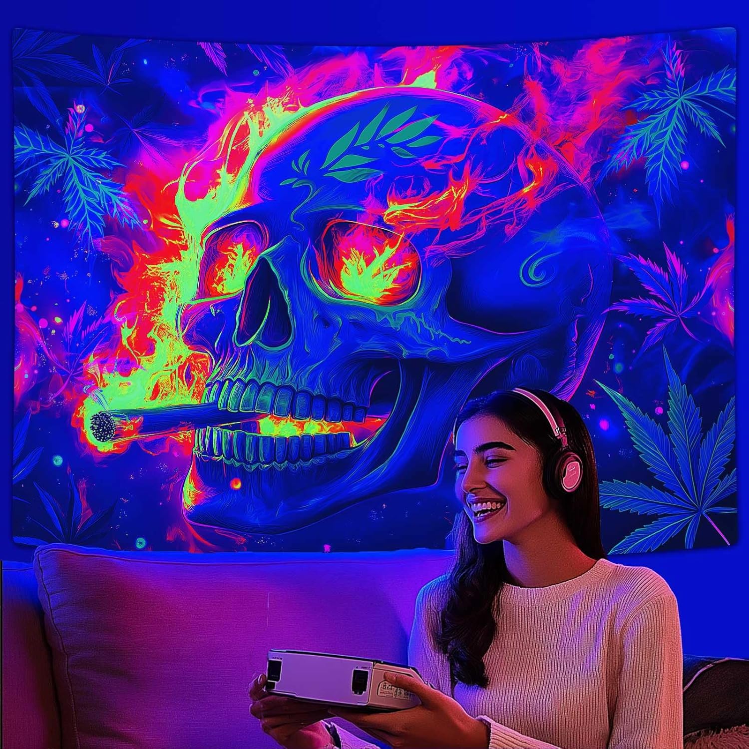- Unique Pattern Design:The blacklight skull tapestry features a mysterious skull, charming mushrooms, and psychedelic flowers and plants. Under black/ultraviolet light, it can fill your room with mysterious and psychedelic colors.