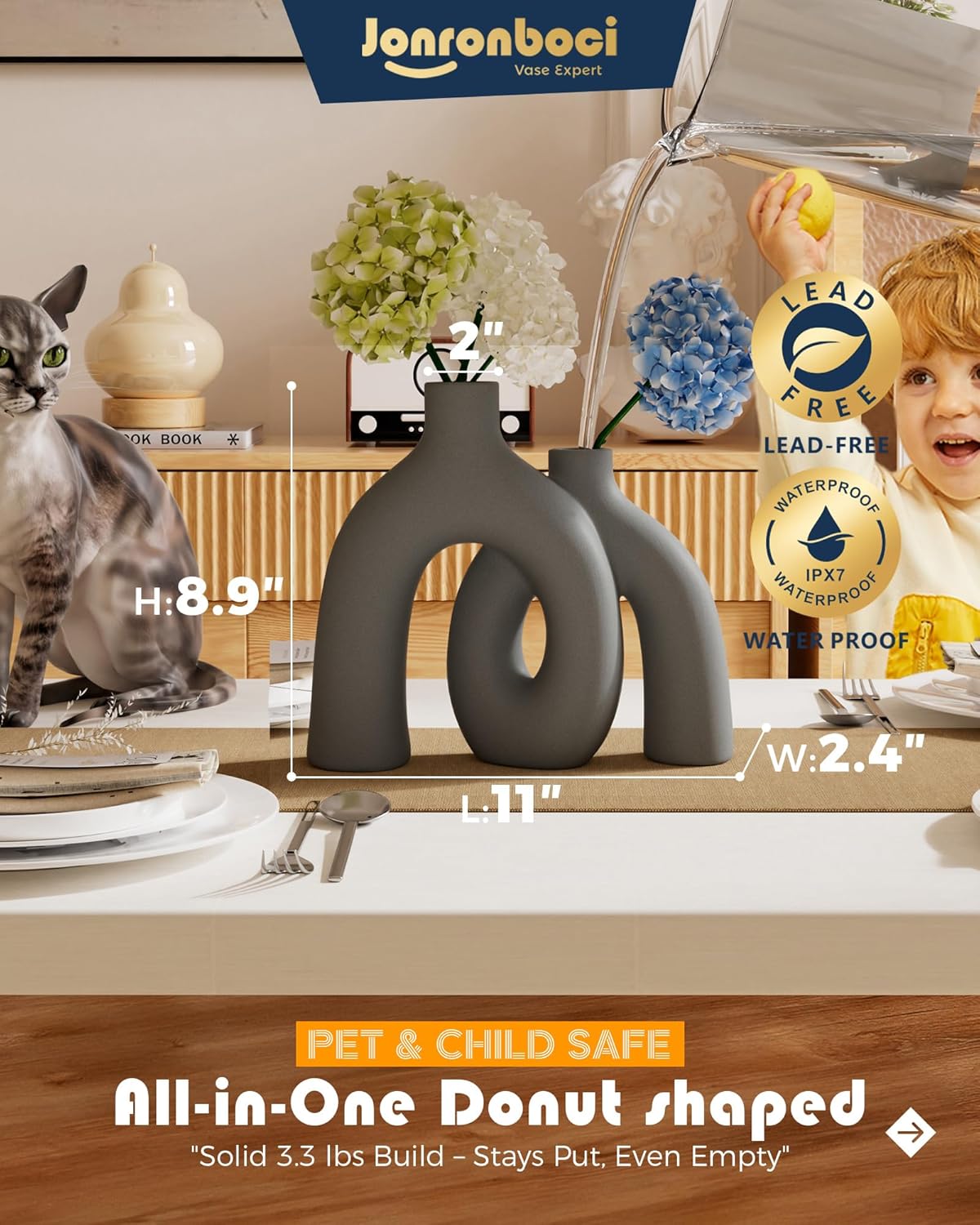 - Size - This set includes one matte dark gray handmade vases. Conjoined Size W 10" X , H Small: 7.3" and Large 8.9", with a vase neck of 1.5". Both vases feature a modern minimalism Industrial style.