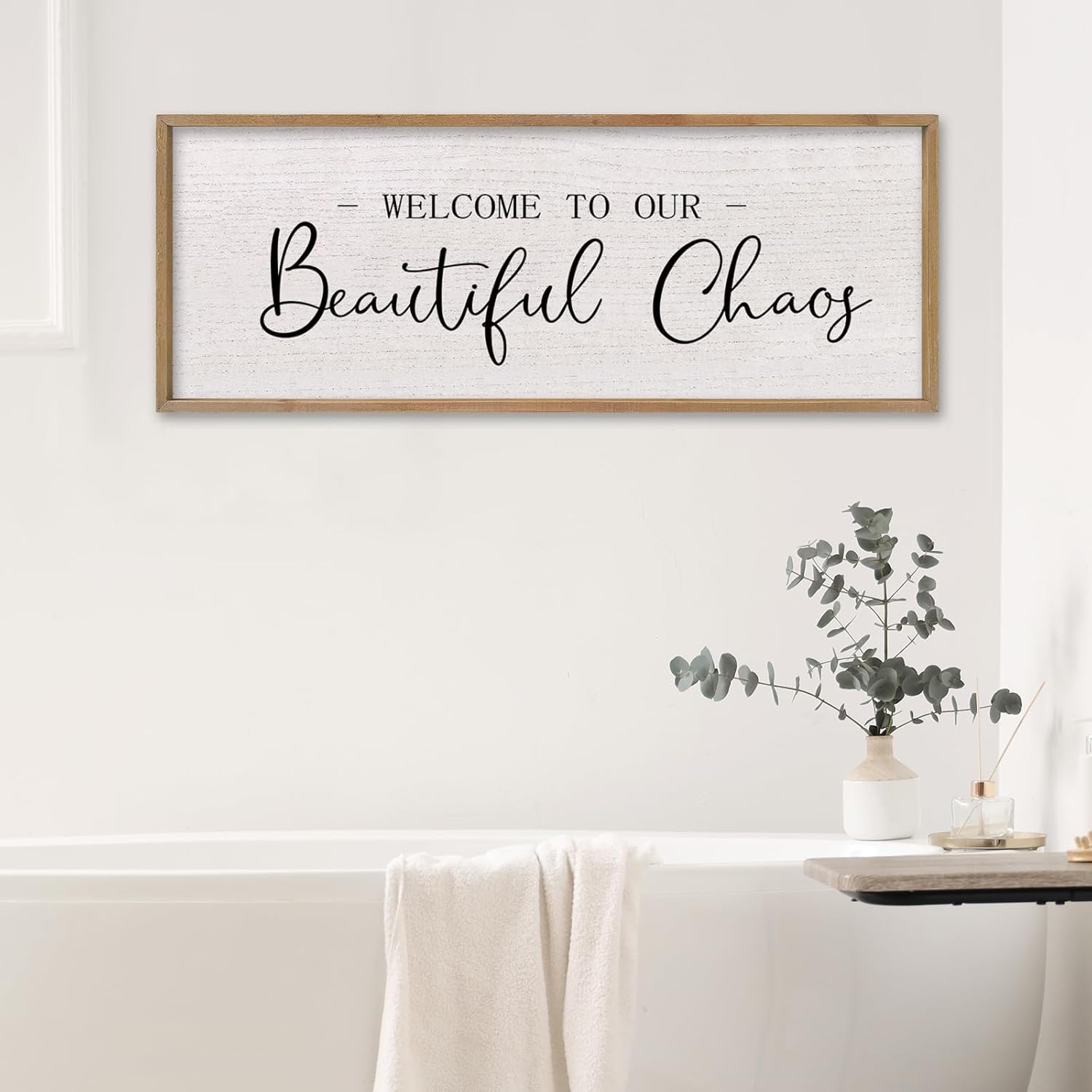 comurdyo Welcome To Our Beautiful Chaos Wall Decor Art 40"X15" for Home Entryway Sign Large Wood Framed Wall Hanging (Wood)