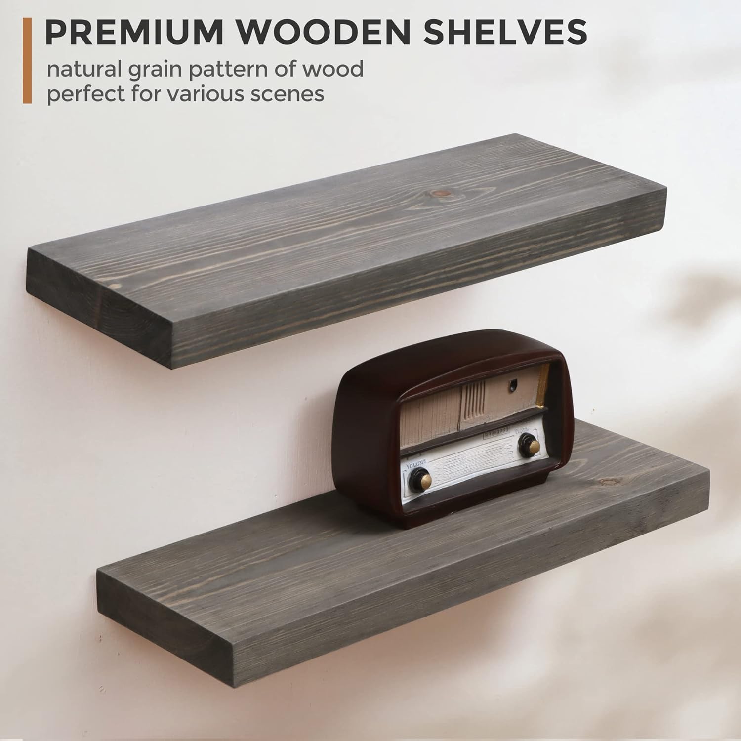 - Rustic Age Look - Our floating shevles shows natural grain pattern of wood. Mount in the bedroom to hold your books, cosmetics and personal privacy things. Mount in the kitchen to hold spices and jars. Or as a display shelf mount in the living room to show your picture frames, trophies or favorite collection. It can be mounted and decorated on every wall of your home, perfect for various scenes, whether display your collection or storage.