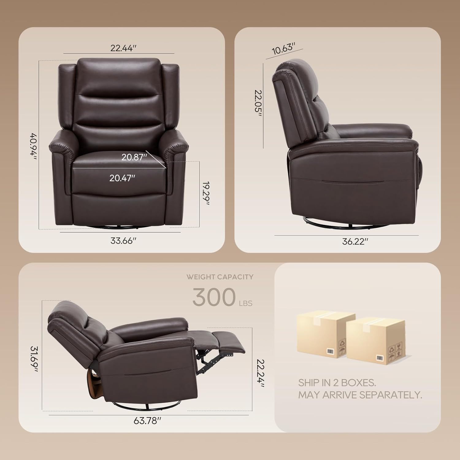 COLAMY Oversized Leather Recliner Chair, 360°Swivel Rocking Manual Recliner with Thick Cushioned Padding Backrest and Wide Seat - Darkbrown