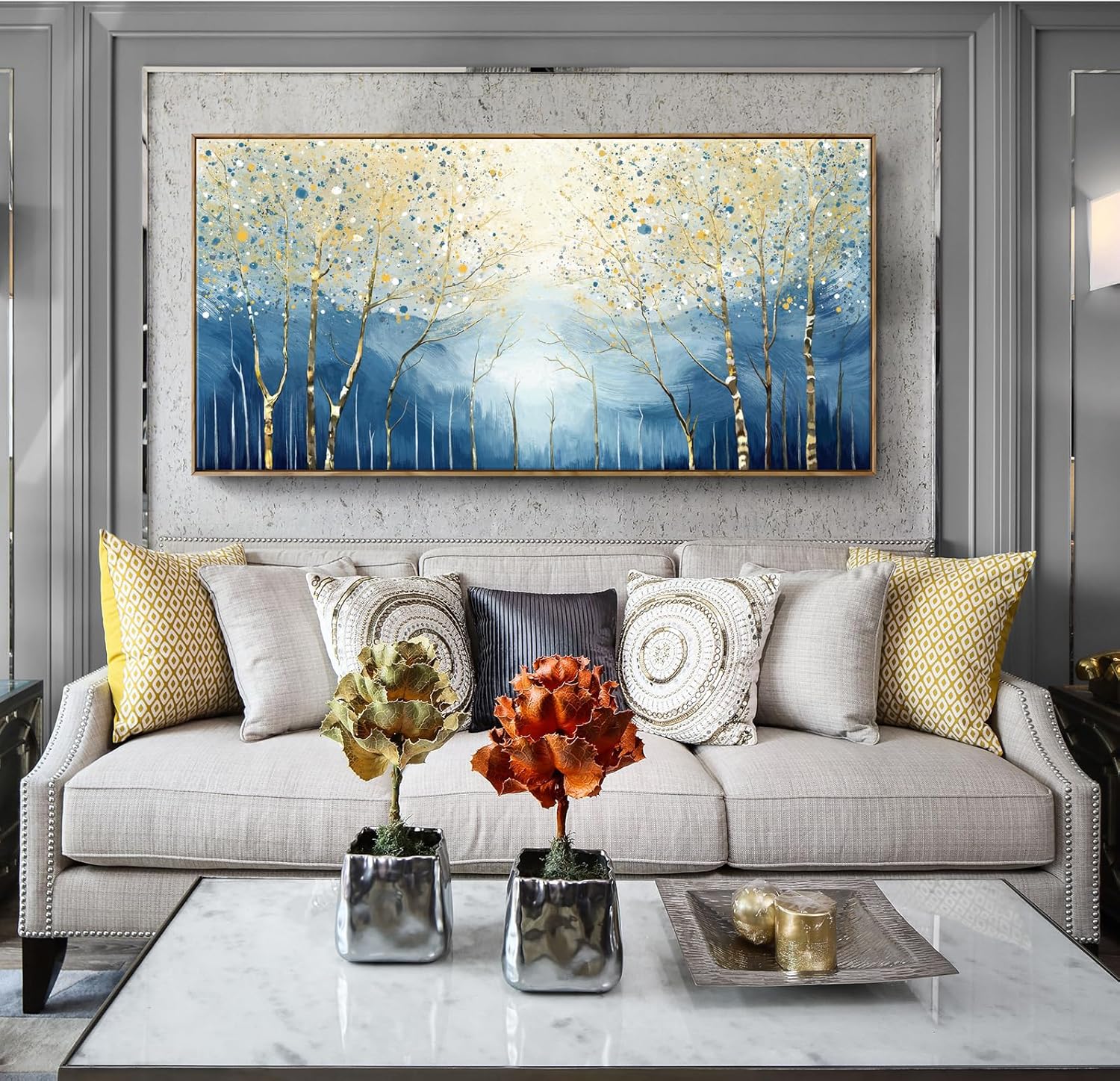 - Modern Abstract Forest Design: This giant minimalist landscapeartwork captures slender birch trunks reaching toward a luminous sky, showered with soft orange and navy-blue splatters that evoke morning light filtering through the trees. The calming blend of cool and warm hues makes it an effortless accent for any room.